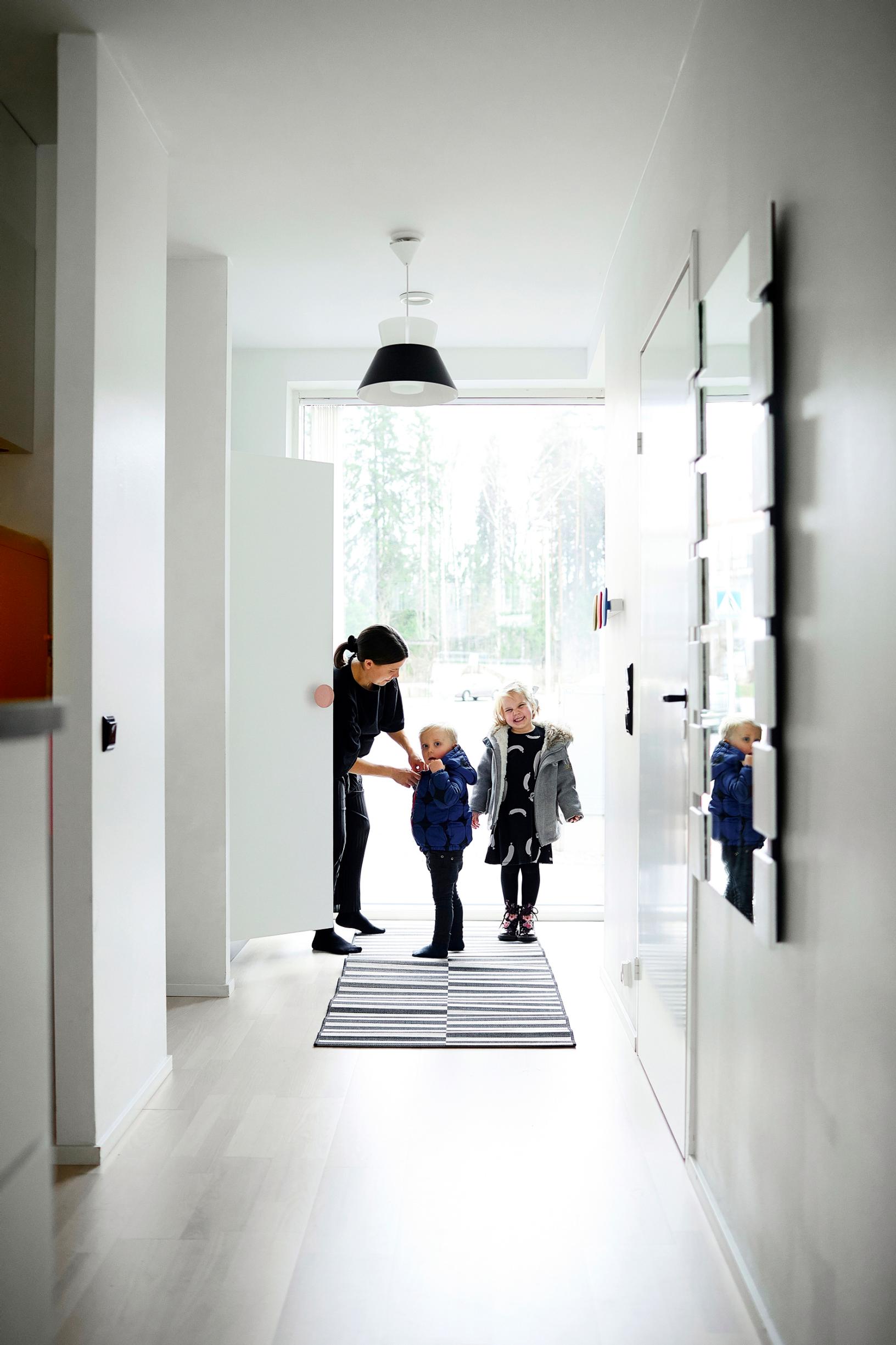 Plussapuoli oman talon rakentamisessa oli juuri se, että saimme itse suunnitella tarvitsemamme tilat eikä hukkatiloja syntynyt. Talossamme on kolme kerrosta, joista päänvaivaa aiheutti eniten toinen kerros. Halusimme maksimoida kerroksen neljän makuuhuoneen tilat. Nappasin turhat neliöt pois saunasta ja kylpyhuoneesta.