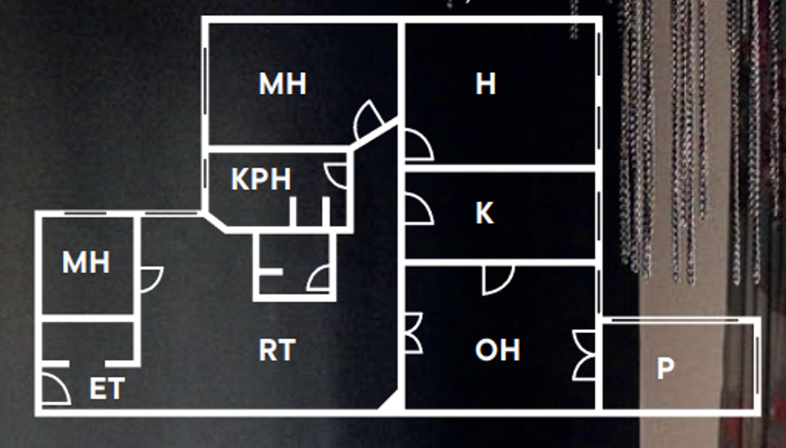 Käytävän päässä avautuu Villen ja Riinan makuuhuone, jonka Qum-silkkimatot on hankittu Helsingistä Imperial-matosta. Sänky on Cassinan ja poninkarvaiset nojatuolit Minottin. Pinkki minkkiturkispeitto löytyi aikoinaan Kreikasta. Sängyn yläpuolelle on ripustettu Marianna Uutisen teos.