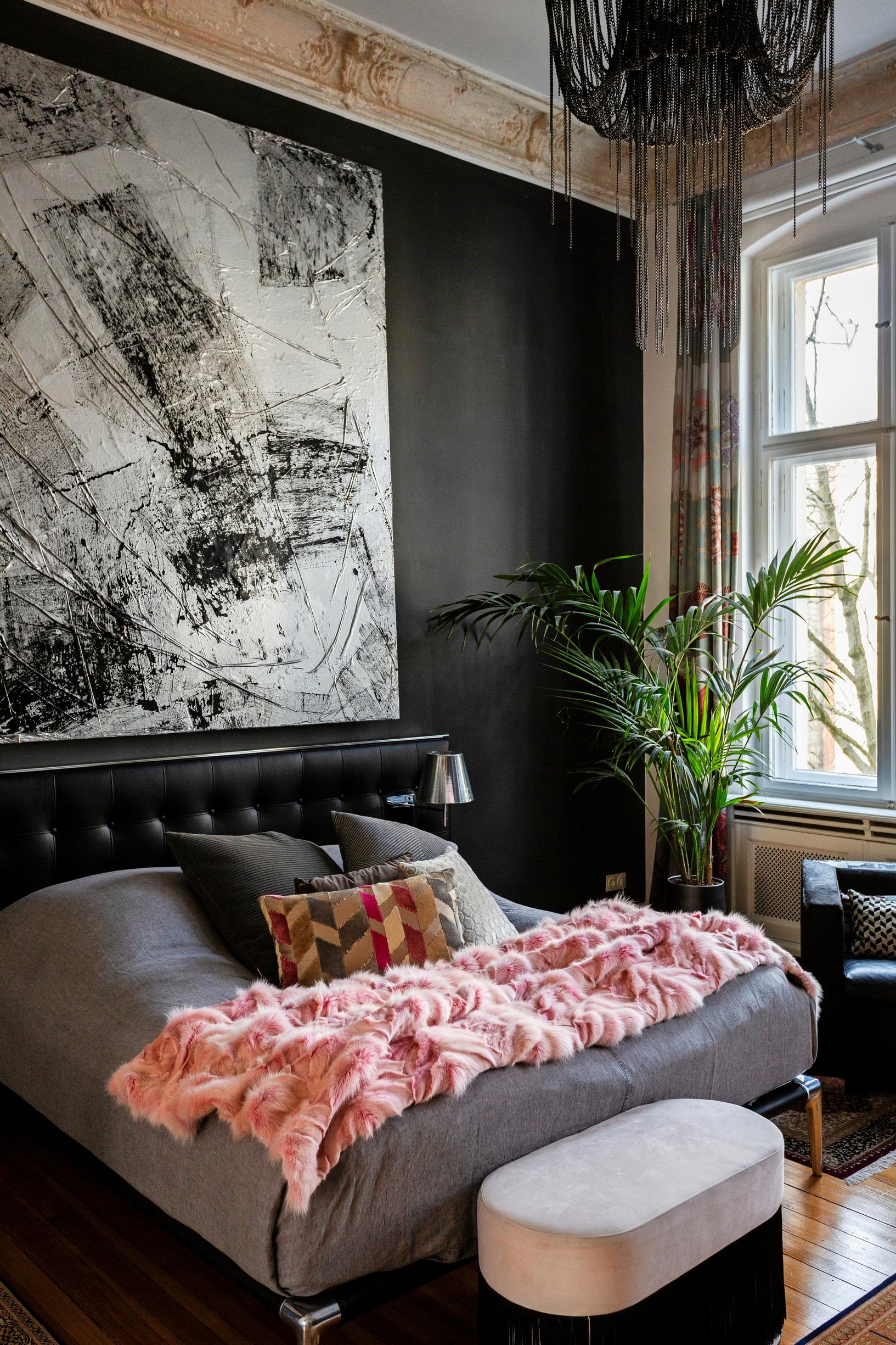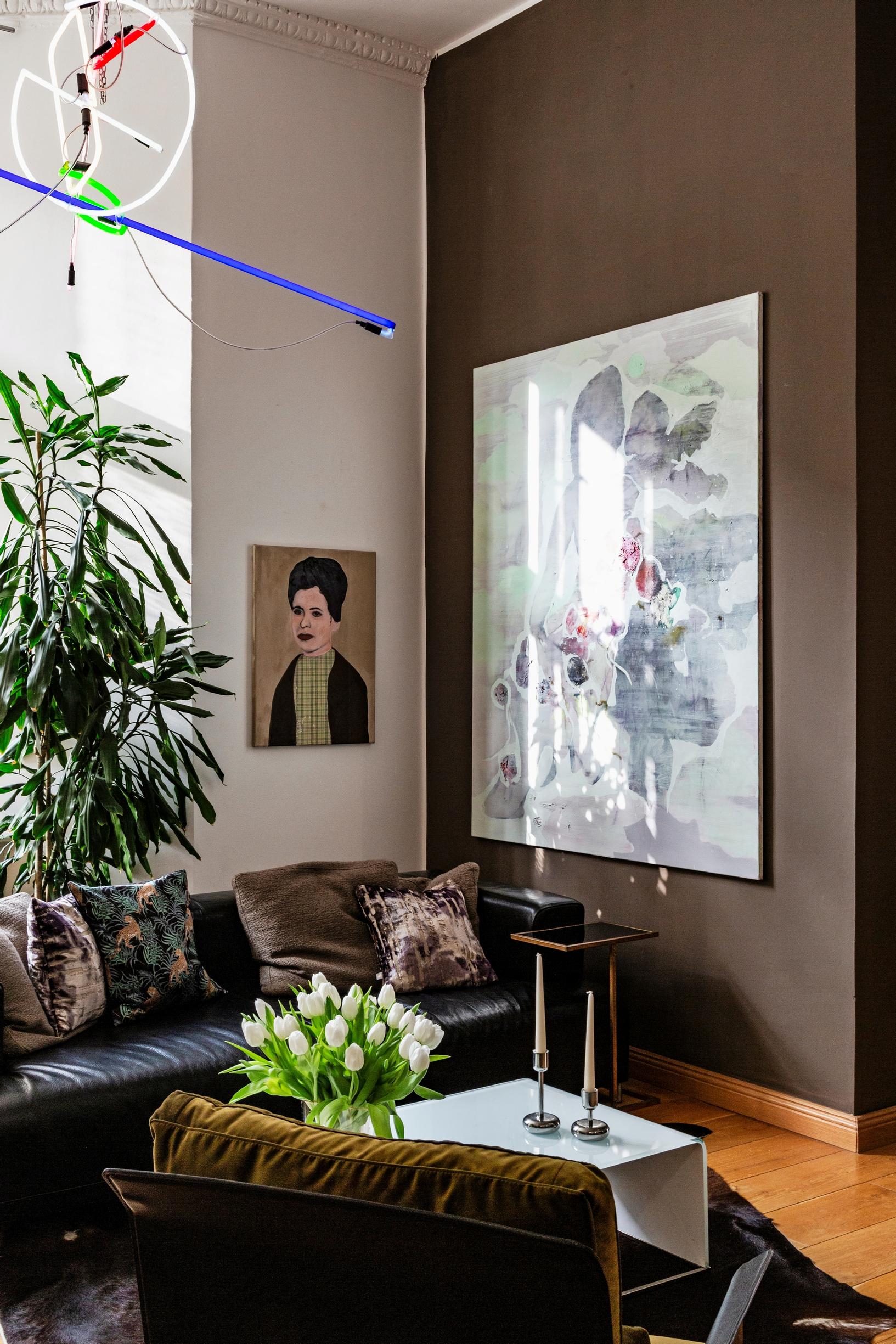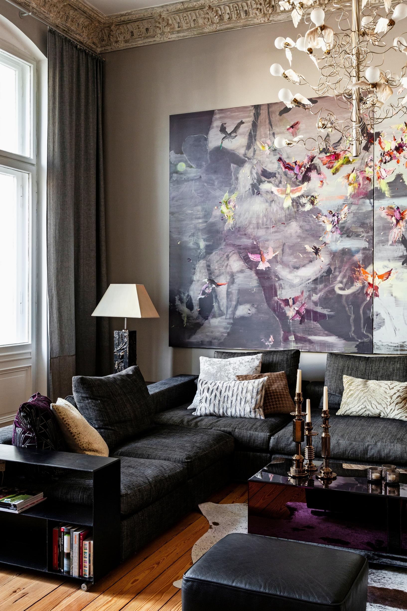 Flexformin sohva ja rahi löytyivät Whoppahista. ”Sieltä on myös suurin osa kodin valaisimista, ja muutama on tarttunut mukaan berliiniläisiltä kirpputoreilta, niin kuin kaupungin tyyliin kuuluu.” Sohvan yläpuolella on Villen teos Birds Fly By Flapping Their Wings. Musta, kiiltävä sohvapöytä on tehty mittojen mukaan käsityönä Tanskassa.