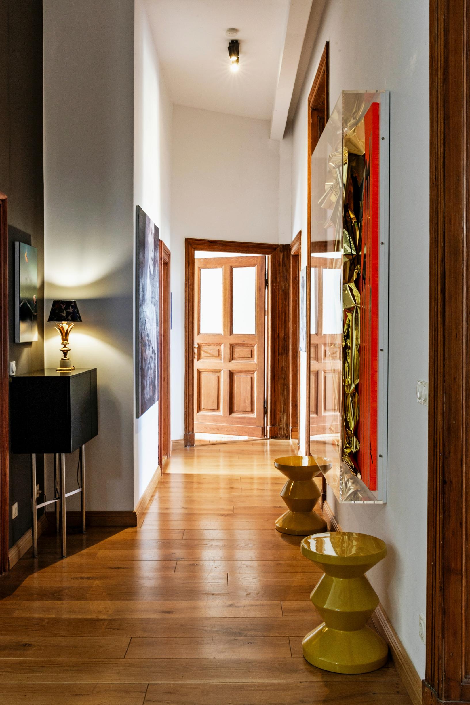 Käytävä, joka johtaa päämakuuhuoneeseen, on harkittu kokonaisuus designia ja värejä. Seinällä loistaa oranssinkultainen teos Anselm Reyleltä. Keltaiset jakkarat ovat Polspottenin. Musta, metallijalkainen senkki on Classiconin mallistosta. Käytävää valaisee pöytävalaisin, jonka jalka on löytynyt belgialaisesta huutokaupasta ja varjostin on teetetty japanilaisesta silkkitaftista.
