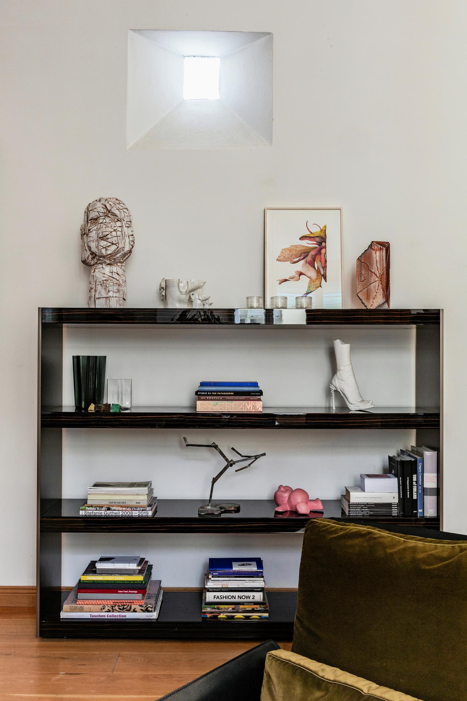 Valkoinen Minottin lepotuoli on Rodolfo Dordonin käsialaa. Musta, kiiltävä sohvapöytä on teetetty mittojen mukaan käsityönä Tanskassa. Tilaa valaisee Ingo Maurerin Birdie Nest.