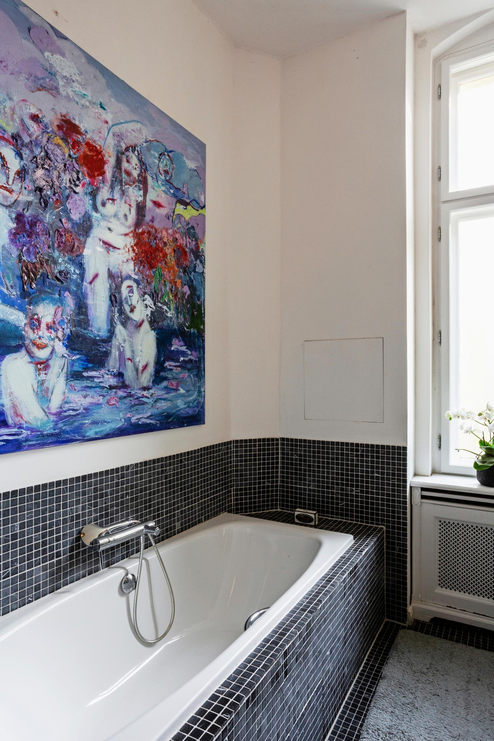 Kylpyammeen yläpuolelle on voitu ripustaa turvallisesti Villen teos Rite of The Wounded People, sillä perhe käyttää pääasiassa samassa tilassa olevaa suihkua. ”Edellisessä kodissamme oli vain amme, joten nyt nautimme suihkun tuomasta arjen helpotuksesta. Amme on jäänyt vähälle käytölle”, kertoo Riina.