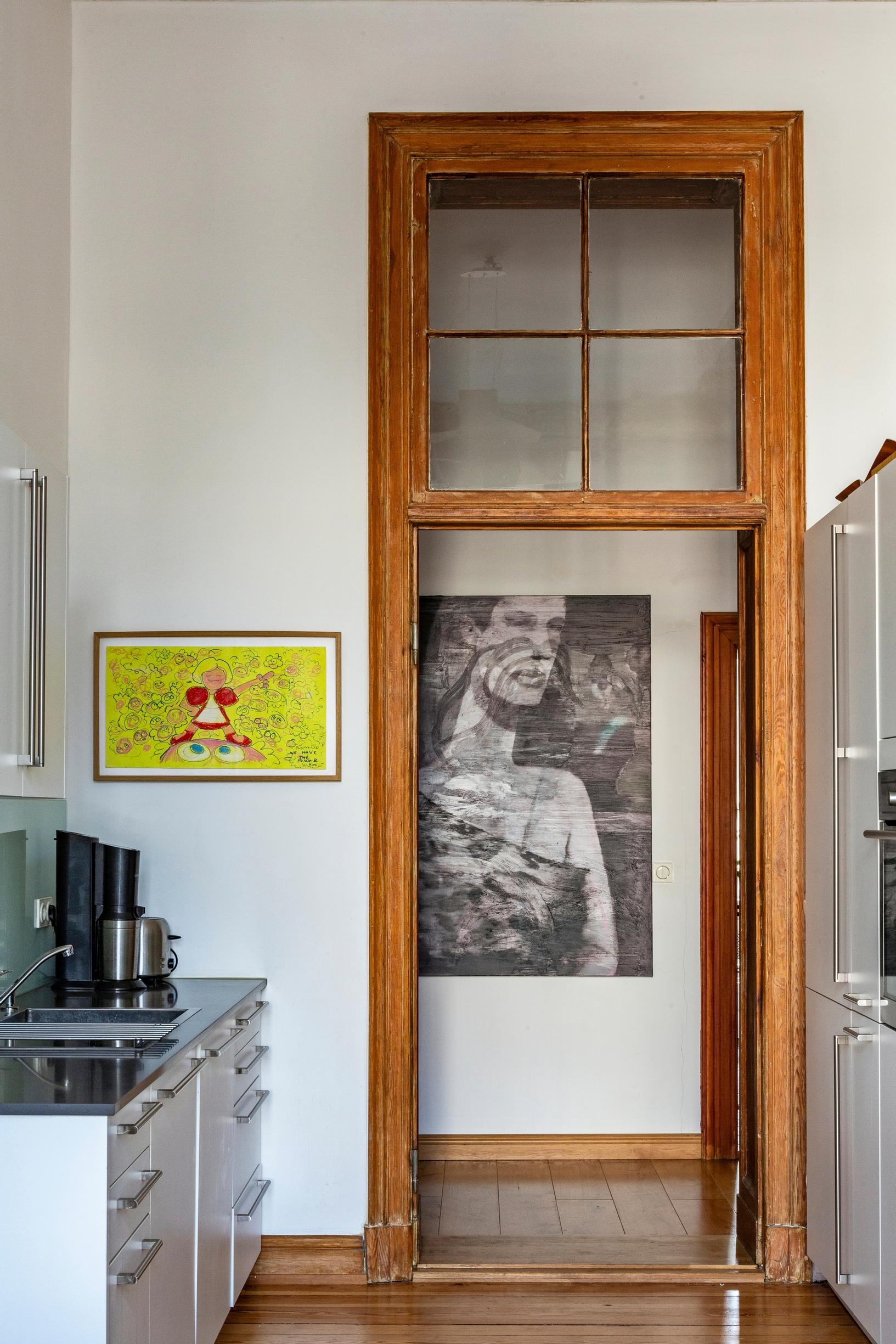 Mustavalkoinen teos keittiön käytävällä on Villen Never Say Goodbye ja pieni keltainen teos puolestaan Kirsi Mikkolan. Museoviraston suojelemassa talossa on jäljellä runsaasti alkuperäisiä yksityiskohtia, kuten kaunis ikkuna sisäoven yläpuolella.