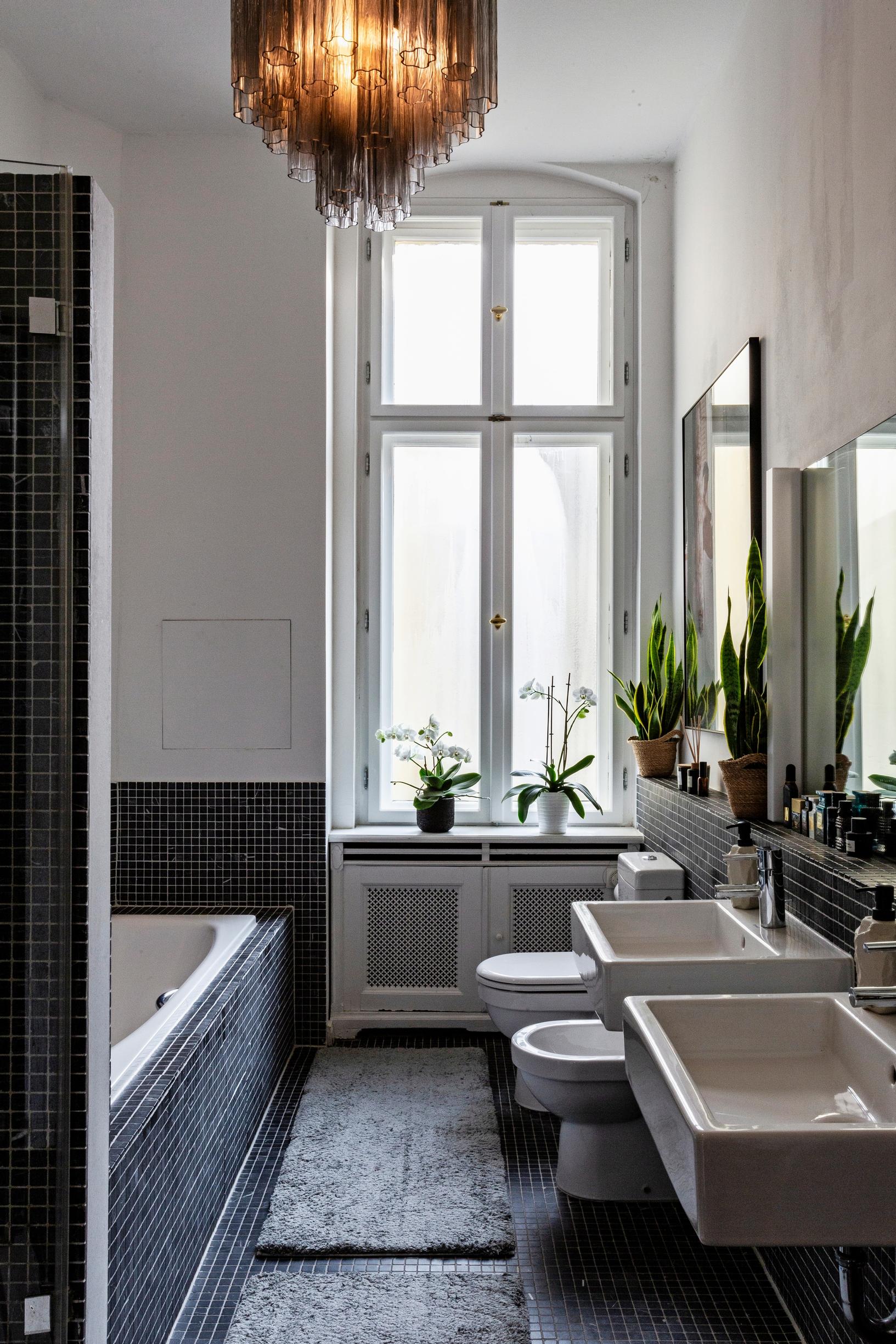 Kylpyhuoneessa komeilee taiteen rinnalla 1970-luvulta peräisin oleva käsin puhallettu muranolainen kattokruunu, jonka pariskunta löysi Etsystä. Ville ehti opiskella muotoilua ennen taideopintojaan, ja kiinnostus muotoiluun näkyy kodin sisustuksessa. ”Taiteilijana löysin oman paikkani, mutta muotoilutaustasta on ollut valtavasti hyötyä projekteissa, joita teen näyttelyiden rinnalla”, Ville kertoo.