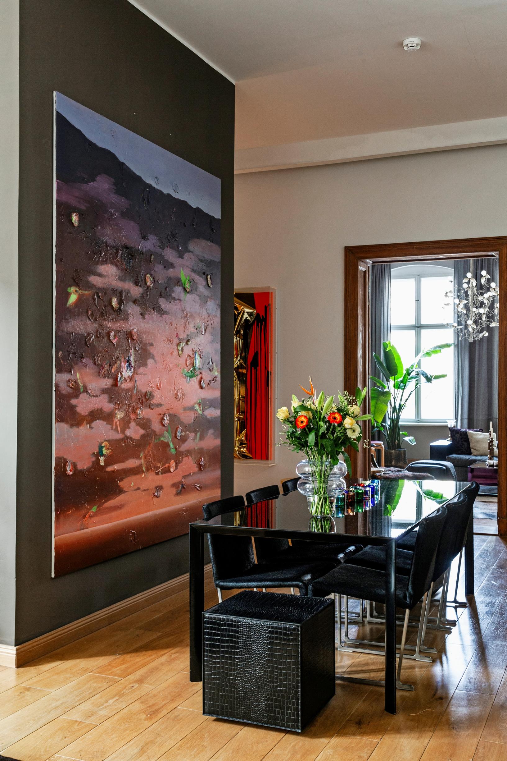 ”13 vuodessa sisustustyylimme on muuttunut skandinaavisesta hieman rönsyilevämpään suuntaan”, Riina naurahtaa. Ruokailutilassa katseen vangitsevat Porron musta, kiiltäväpintainen pöytä, poninkarvaiset B & B Italian tuolit ja Villen teos Temple Of The Dawn.