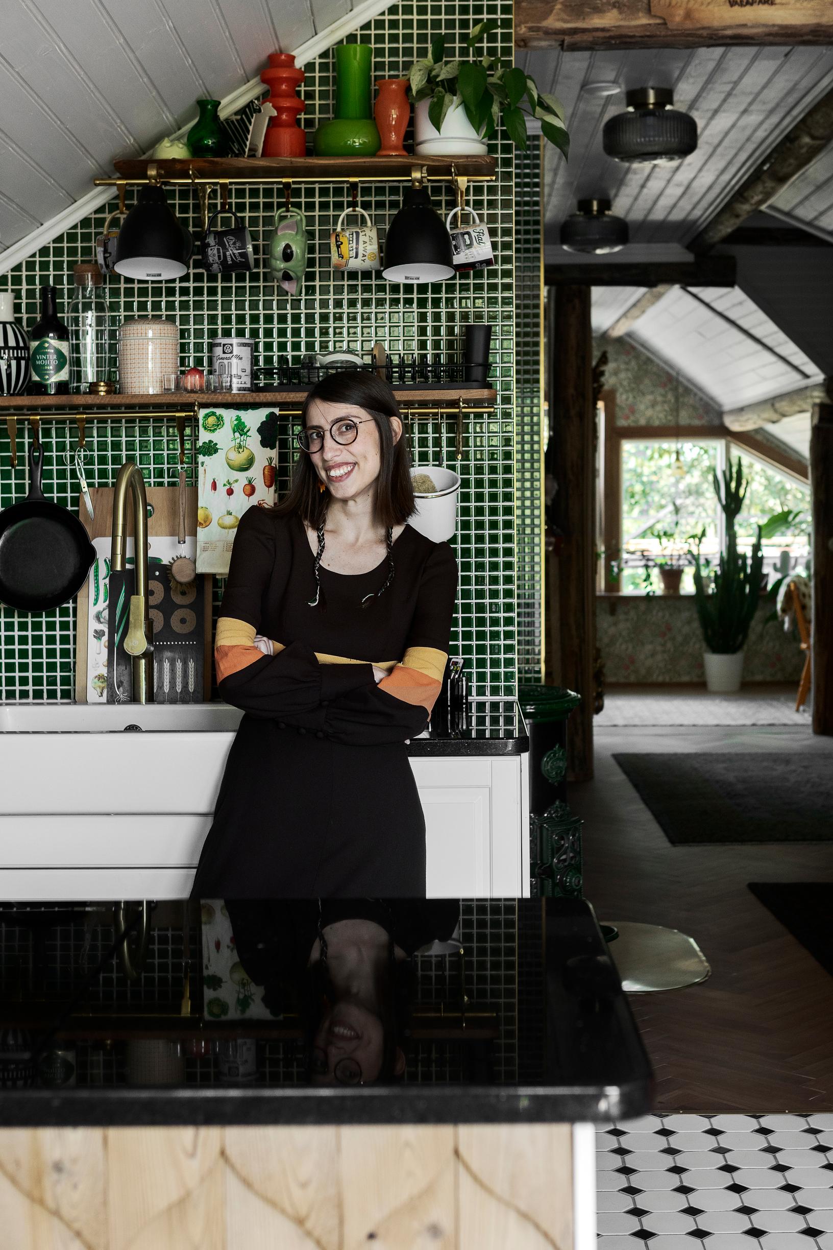 Ulko-ovesta tullaan suoraan keittiöön. Rakkaat pinnatuolit ovat Nadjan mummolta. Ne ovat olleet Nadjan mukana kaikissa hänen kodeissaan. Ruokapöytää voi jatkaa kahden klaffin verran, mutta juhlat pidetään alakerran navetan kasvihuoneen puolella.