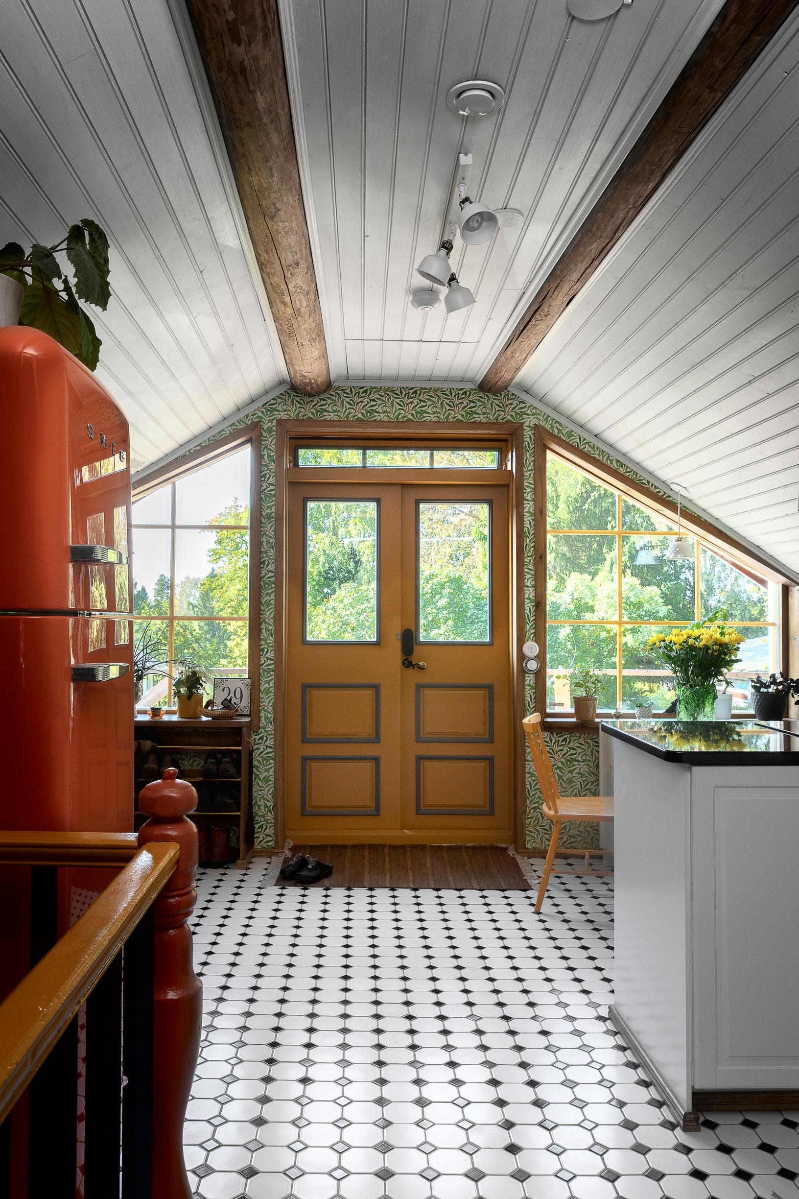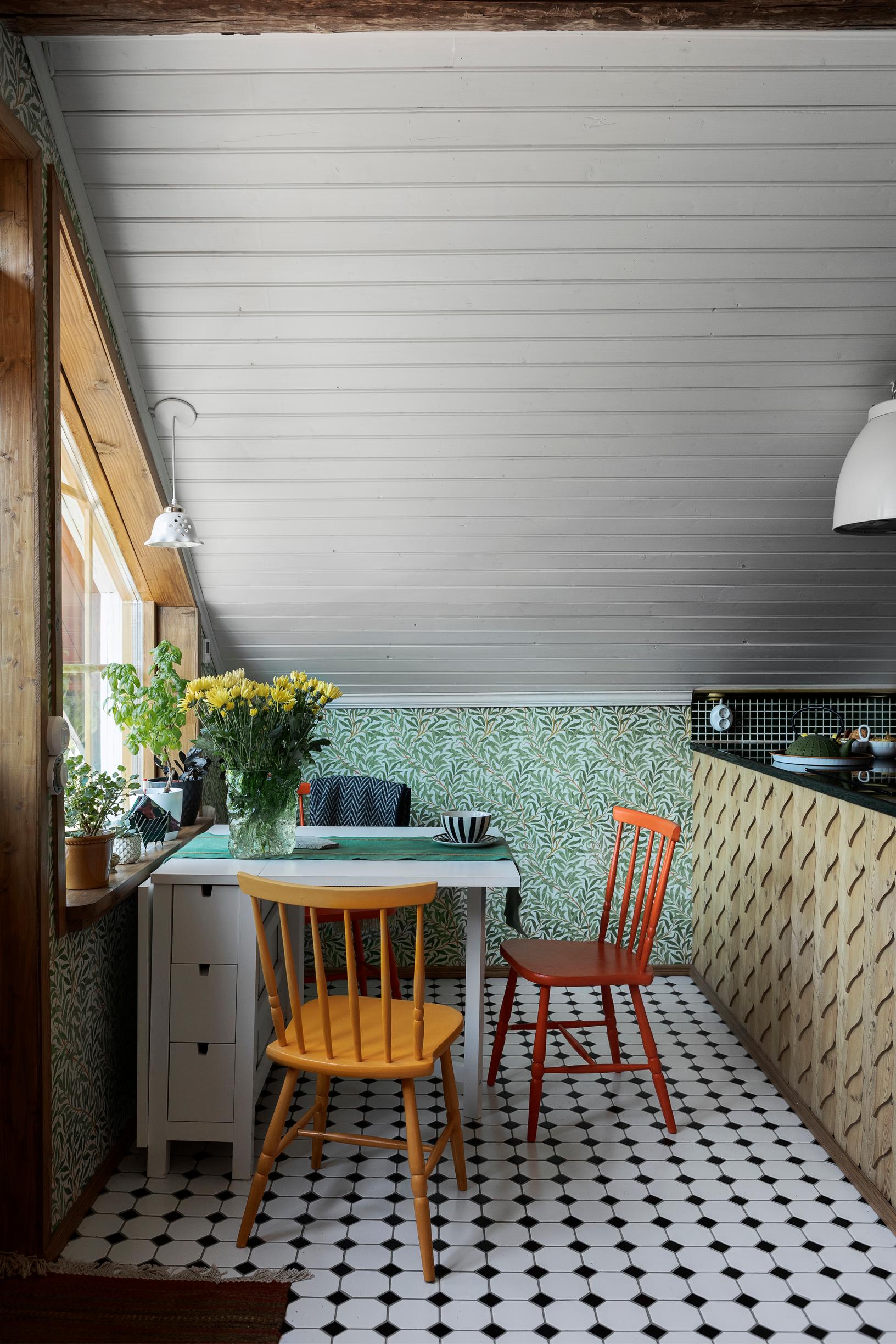 ”William Morrisin Willow Boughs -tapetti sitoo yhteen kaikki tilassa olevat värit: jääkaapin oranssin, välitilan vihreän laatan ja ulko-oven keltaisen.”