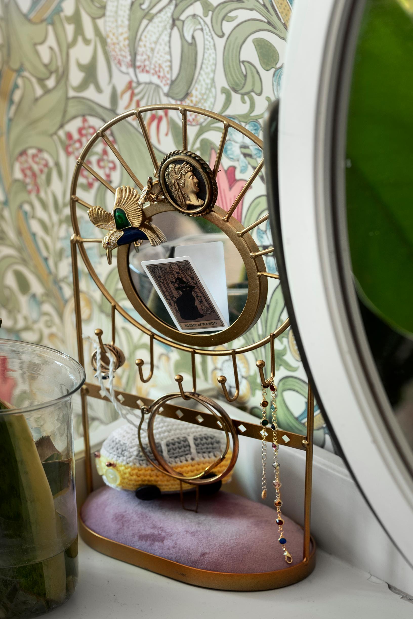 Nadjan peilipöydän koruteline on Flying Tiger Copenhagenista. Nadja pitää erityisesti rintaneuloista, ja vaatteissa vintage on valttia. Virkattu Kleinbus muistuttaa pariskunnan yhteisestä harrastuksesta.