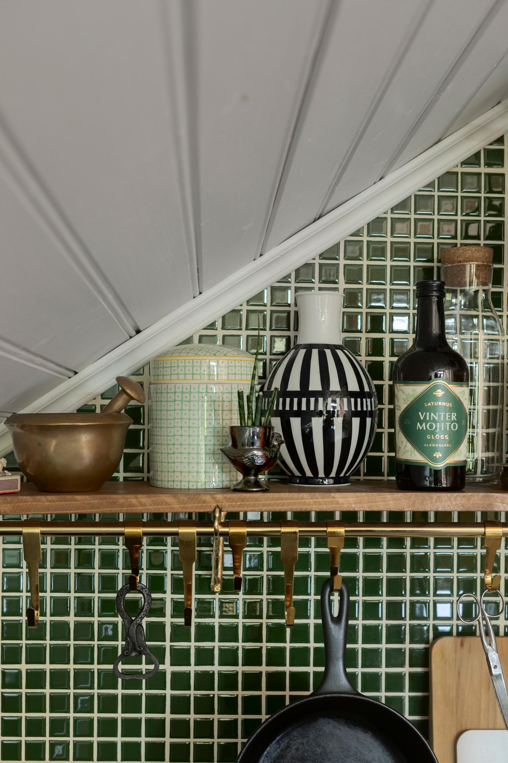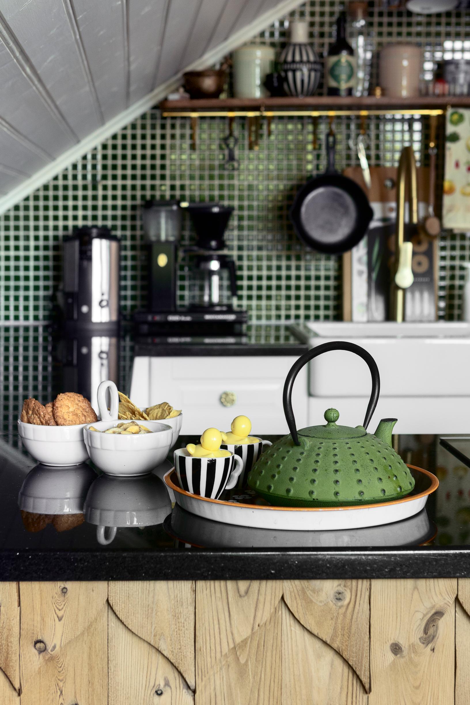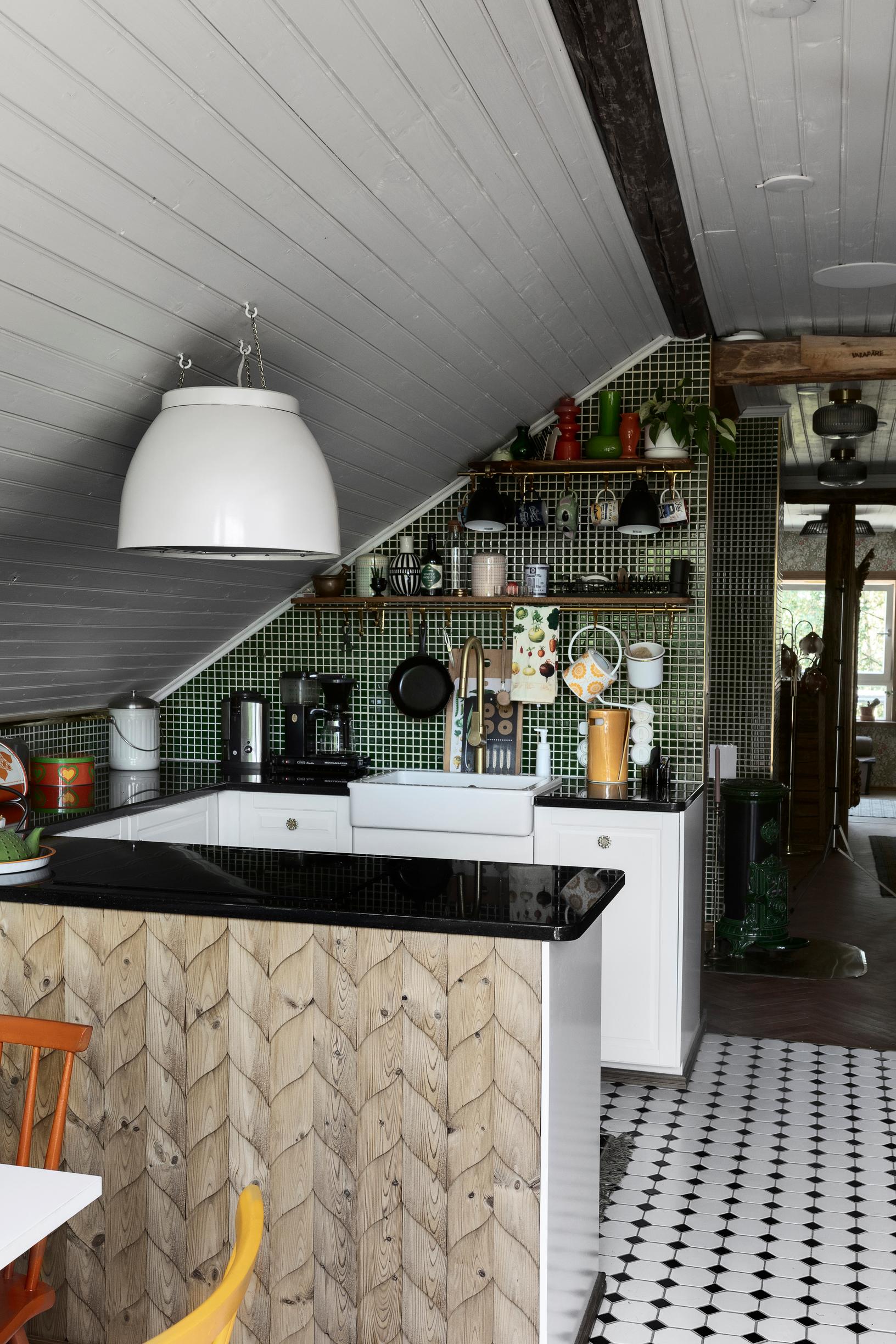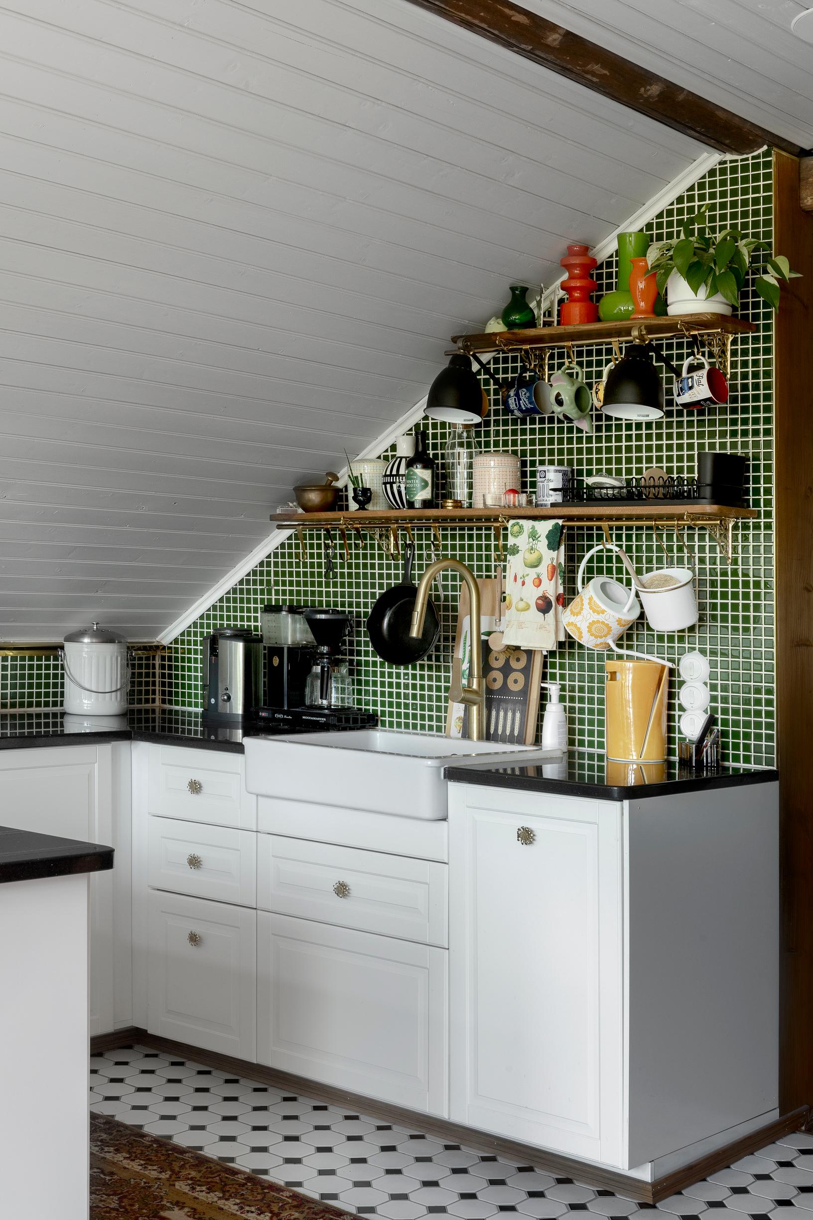 Keittiön suunnittelu tuotti päänvaivaa. Miten vinon katon alle saisi mahtumaan kaiken tarvittavan? Avohyllyt pitävät pienen keittiön ilmeen ilmavana. Posliininen allas on Ikean. Tasot ovat Star Galaxy -graniittia Ylöjärven Kivilähteeltä. Keittiönkaapit ovat Ikeasta.