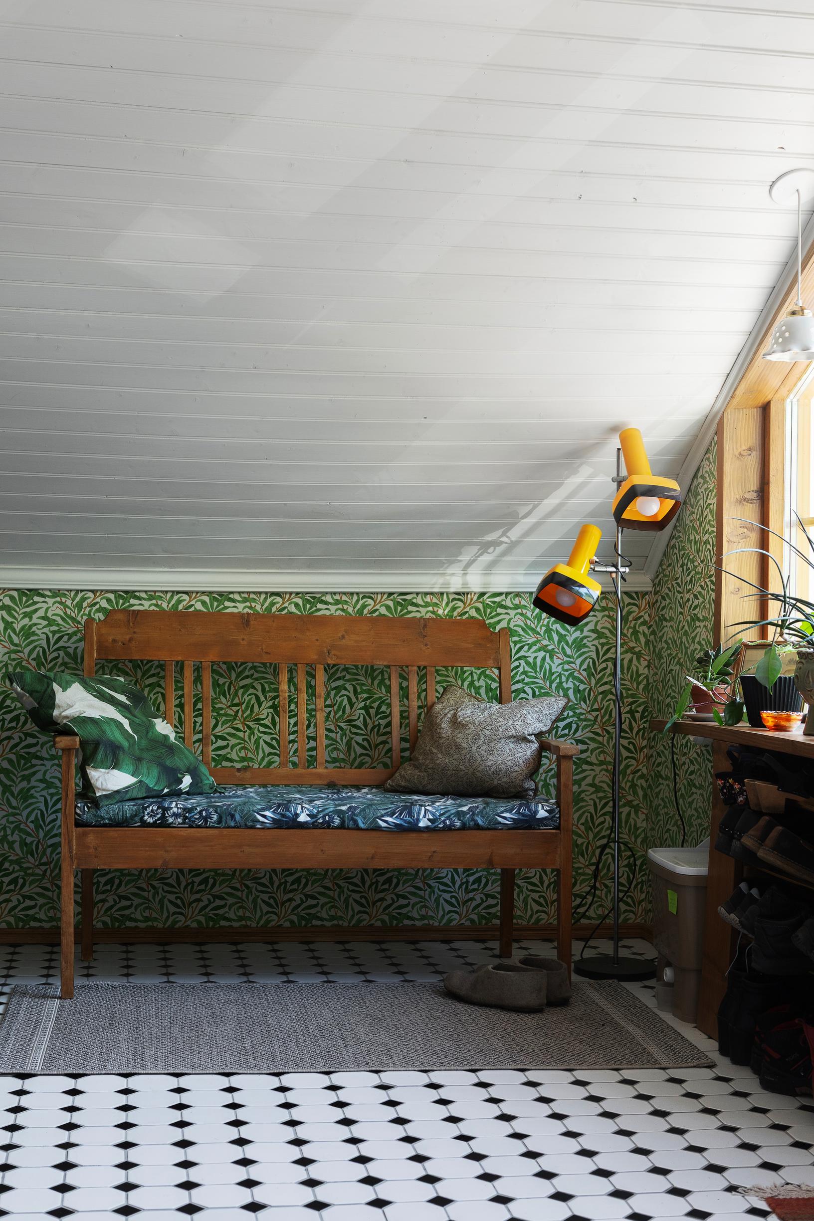 Eteisen penkki oli alun perin ootrattu. Nadja hioi huonokuntoisen koristemaalauksen pois ja käsitteli sen saman sävyiseksi kuin muutkin kodin ruskeat puupinnat. Jalkavalaisin on 1970-luvun helmi, jonka Nadja peri tädiltään. Ikkunan alla on Akin tekemä kenkähylly. Lattiassa on LPC Art Octagon -laatat. Tapetti on William Morrisin Willow Boughs.