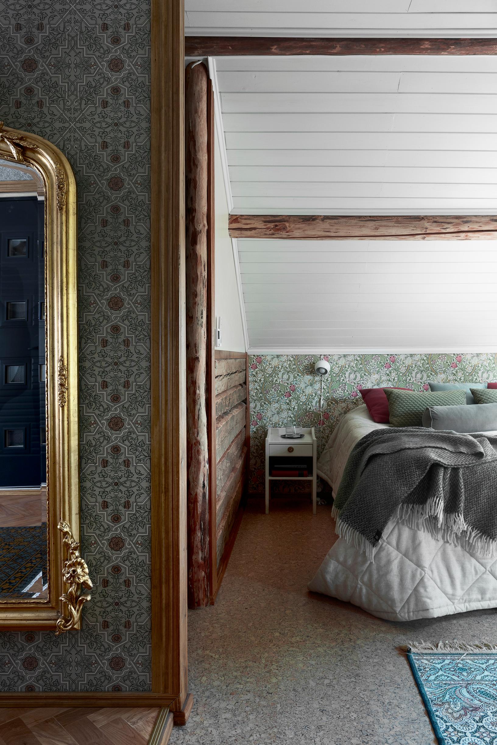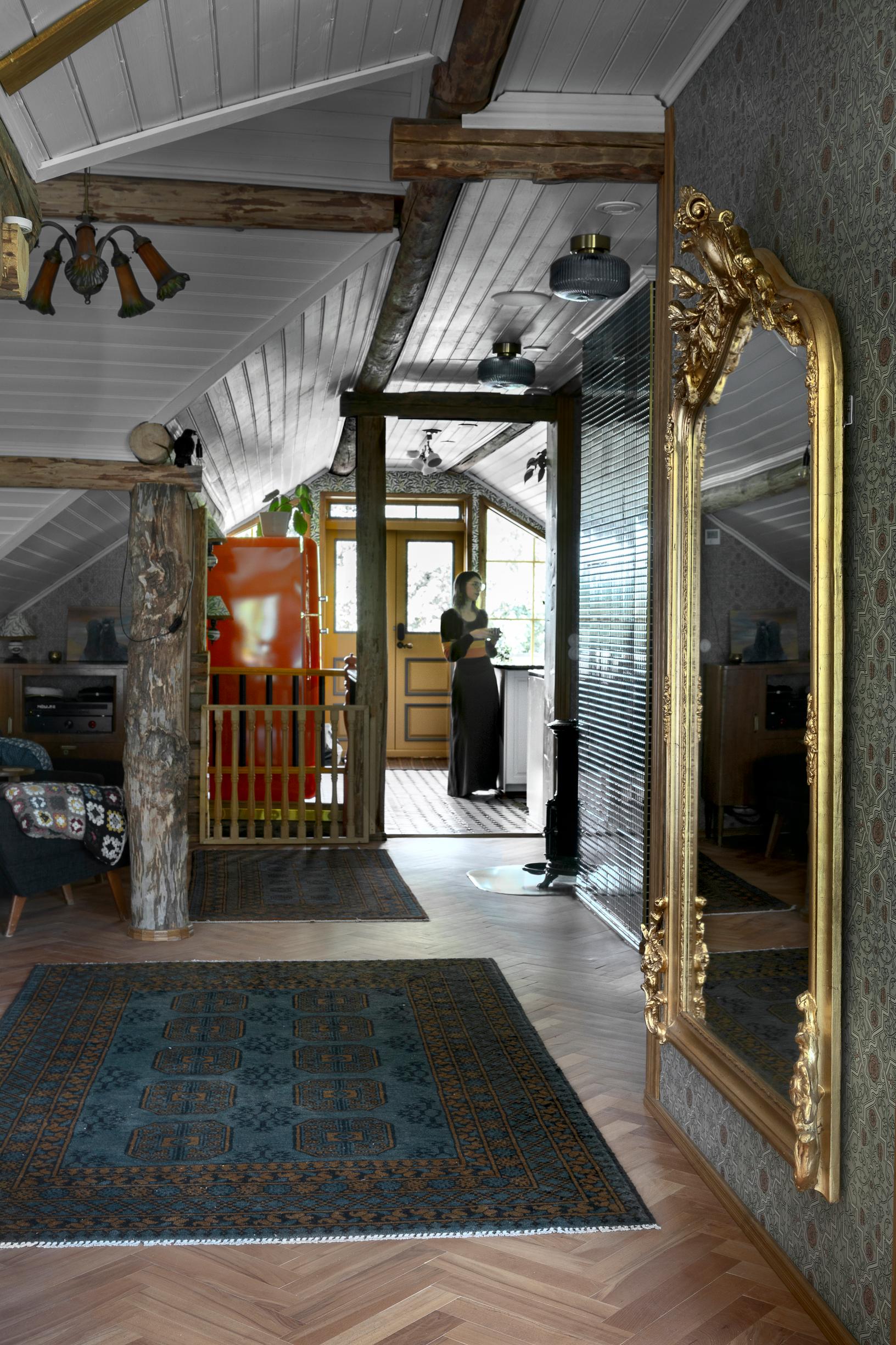 Nadja on loihtinut puorin vintille viihtyisän kodin, jossa kullattu kipsikehyspeili kohtaa hirren. Kasvihuoneilmiöstä hankittua peiliä vastapäätä tulee kulku navetan ylisille, kunhan remontti saadaan valmiiksi. Parketti on ostettu huutokaupasta.