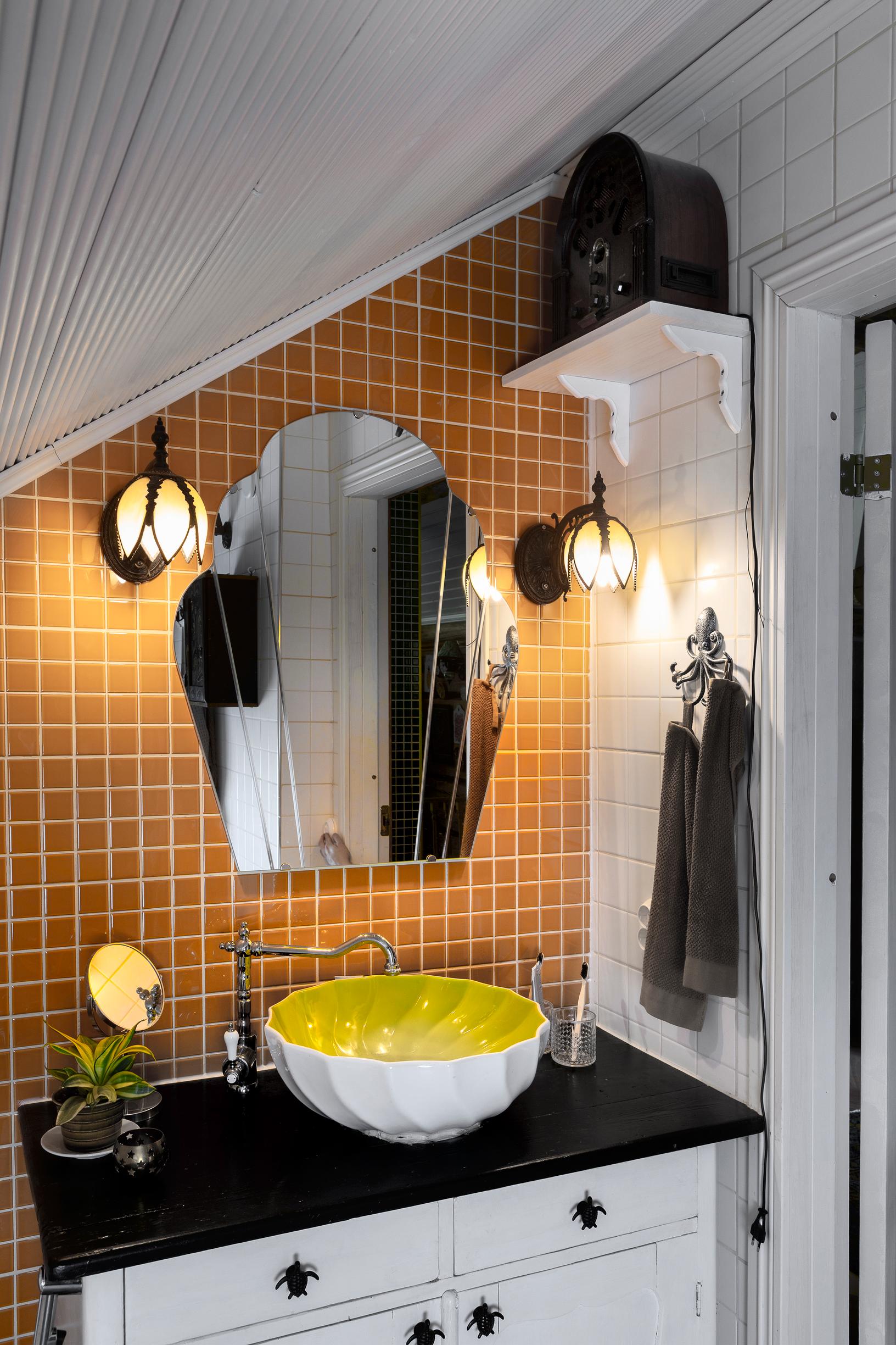 Kylpyhuoneen laatat hankittiin keittiöön, mutta kun Nadjan eteen tulivat kauniin vihreät laatat, suunnitelma meni uusiksi. Peili on Ikeasta. Valaisimet löytyivät Juthbackan markkinoilta. Malja-allas on sisustusliikkeestä Seinäjoelta.