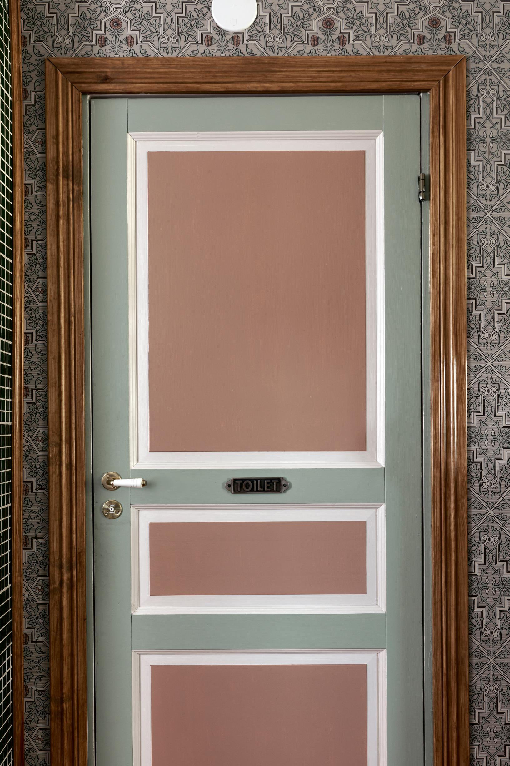 Kylpyhuoneen ovi oli alkujaan valkoinen, mutta se ei näyttänyt Nadjan silmään hyvältä. Värit on poimittu tapetista. Nadjan Instagram-seuraajat saivat äänestää värikombon.