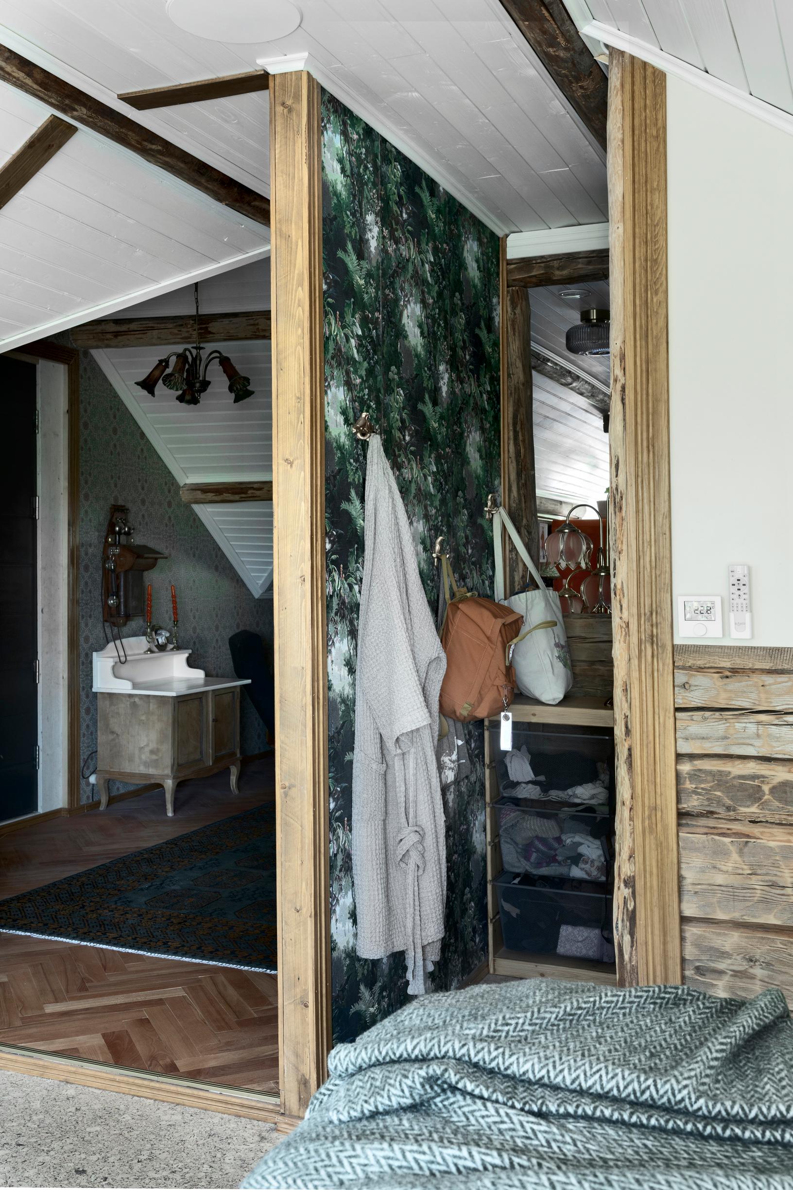 Erillinen vaatehuone on säilytysihme. Sen seinässä on Living Wallsin History of Art -tapetti. Nadja ihastui siihen, koska siinä on lintuja. Hän löysi sen jo ennen kuin rakennusprojekti oli mielessä.