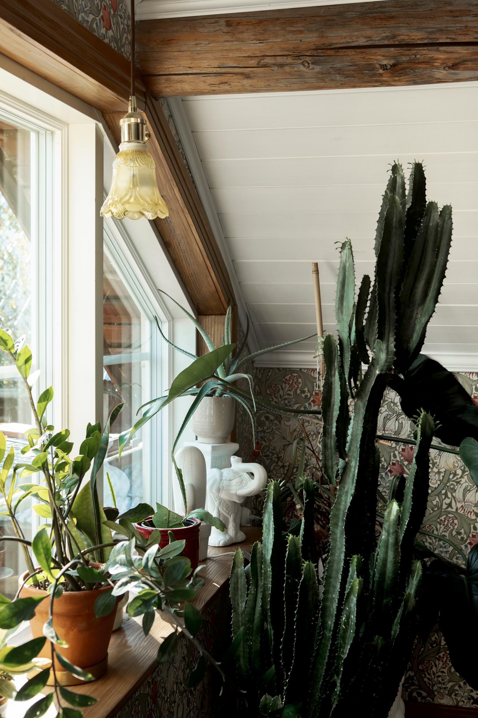 Nadja Törnroos kaipasi lisää tilaa viherkasviharrastukselleen. Sitä löytyikin appiukon maatilalta, jonka 100-vuotiaan viljavaraston vinon katon alle Nadja remontoi puolisonsa Aki Alasen kanssa kierrättäen sisustetun kodin.