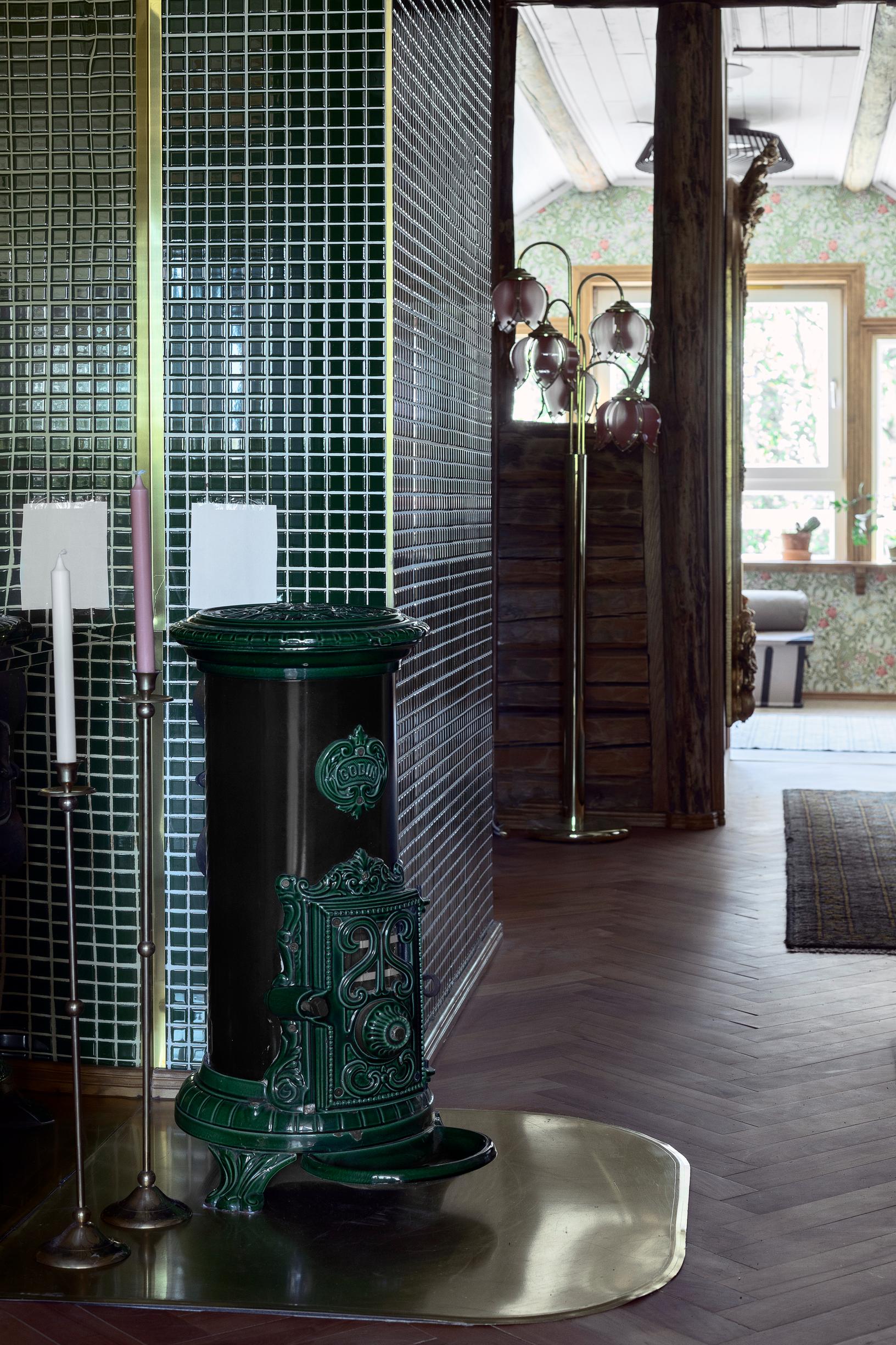 Emaloitu kamiina on Godin-merkkinen. Nadja löysi omansa Torista. Ystävä haki kamiinan ensin Kuopioon, josta matka jatkui kohti Jalasjärveä Ford Fiestan takakontissa. Kamiina on talvella korvaamaton sähkökatkojen ja tunnelman vuoksi. ”Lattian koolaukset ovat alkuperäiset, samoin siellä täällä näkyvät hirret. Minusta hirsien pitää näkyä, kun asuu maalla.”