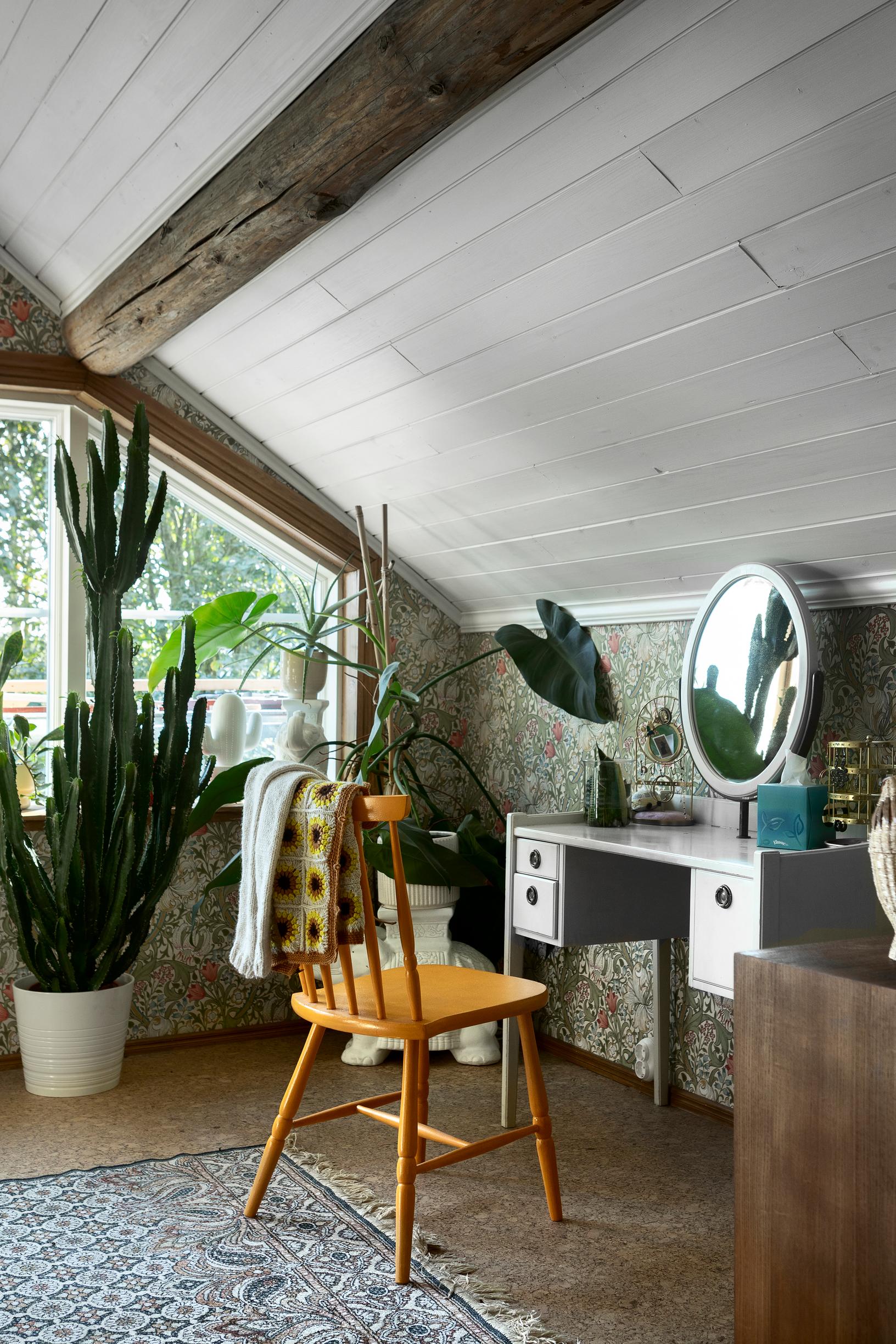 Nadja löysi siron 60-luvun kampauspöydän Peräseinäjoen kirpparilta. Makuuhuoneen ikkunan edessä on hyvin valoa kasveille. Iso tyräkki on ollut Akilla 15 vuotta. Remonttiaika verotti kodin viherkasveja, mutta nyt suunta on ylöspäin.