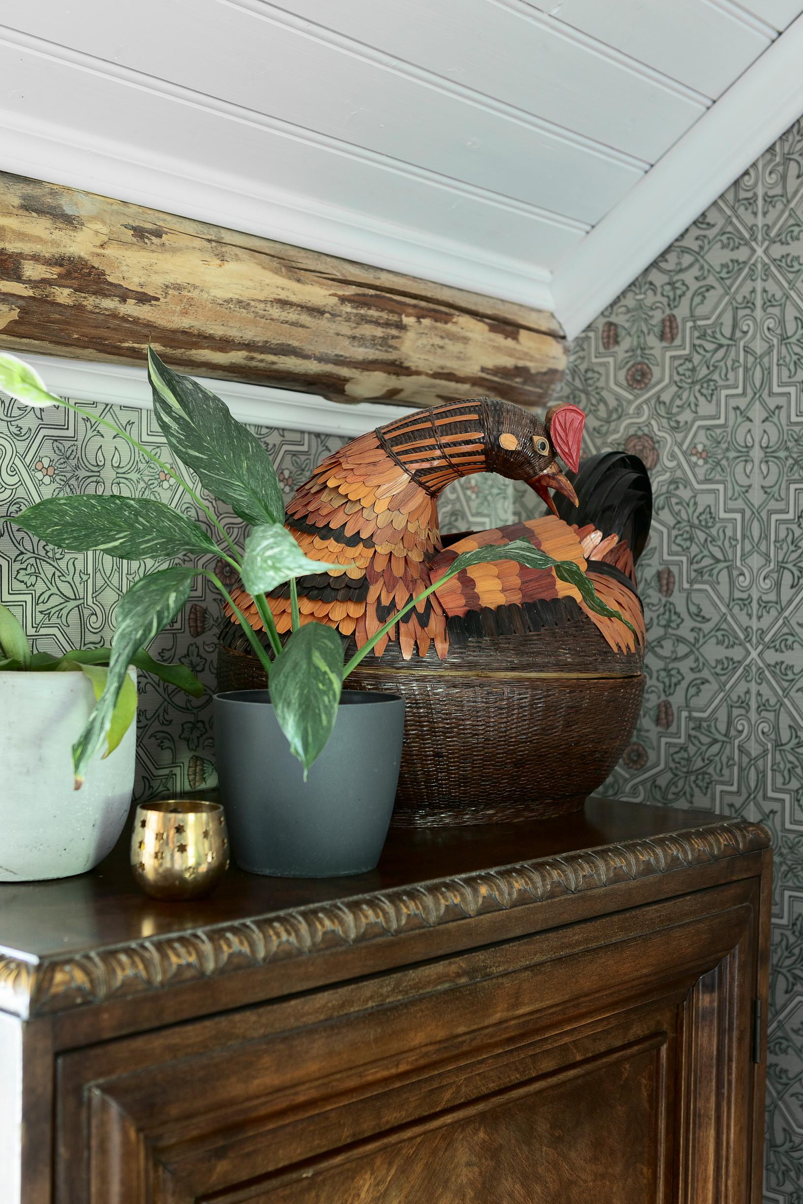 Nadja kerää lintukoreja. Punottu kanakori on Kasarmin aarteista Hämeenlinnasta. Kaappi on Facebookin Marketplacesta. Nadja viljelee vehkoja. Kaksivärinen lehti on ’Domino’-lajikkeen geneettinen värivirhe.