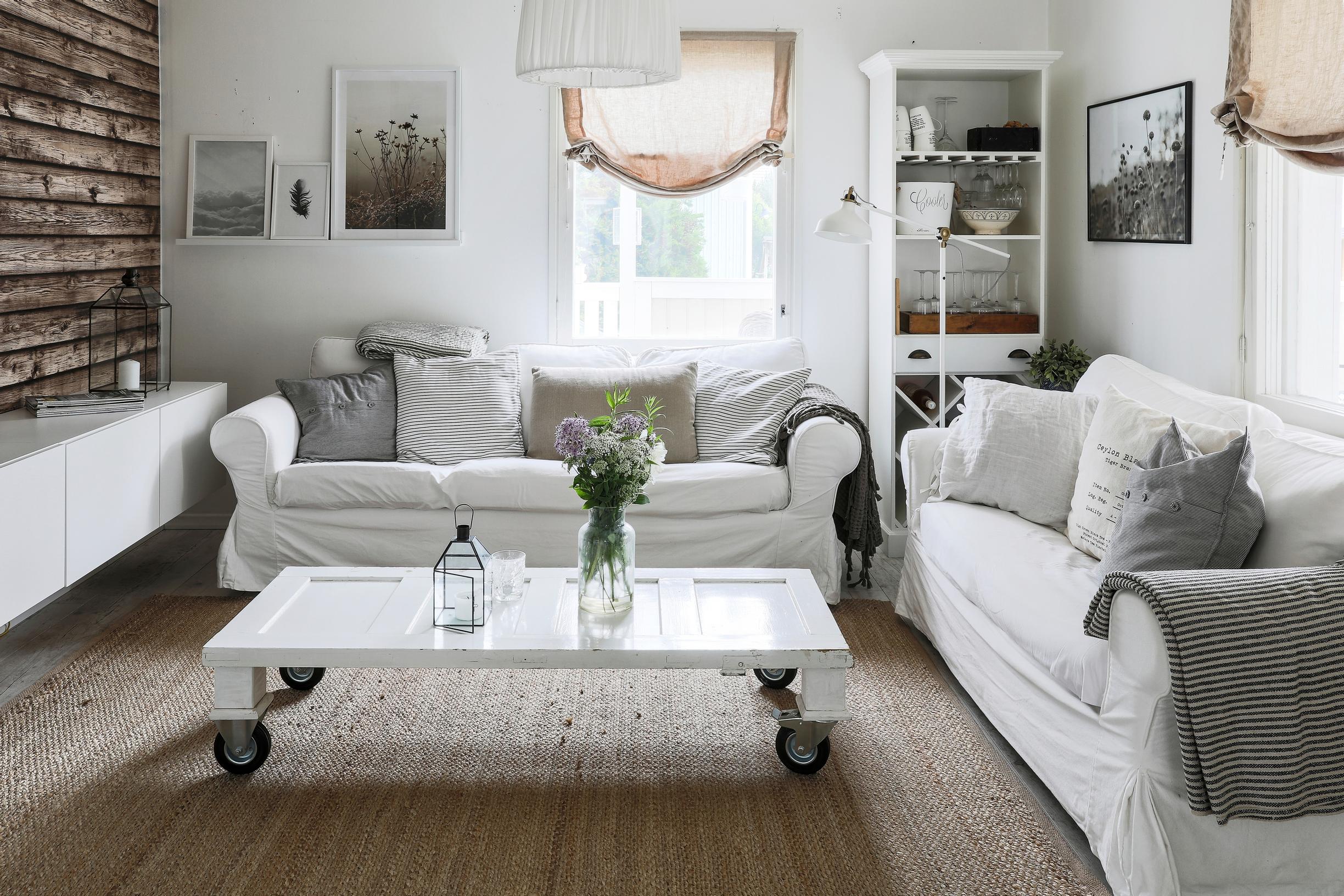 Myös Niinan ja Juhan kermajäätelön värisessä puutalossa sohvapöytä on itse tehty vanhasta ovesta.