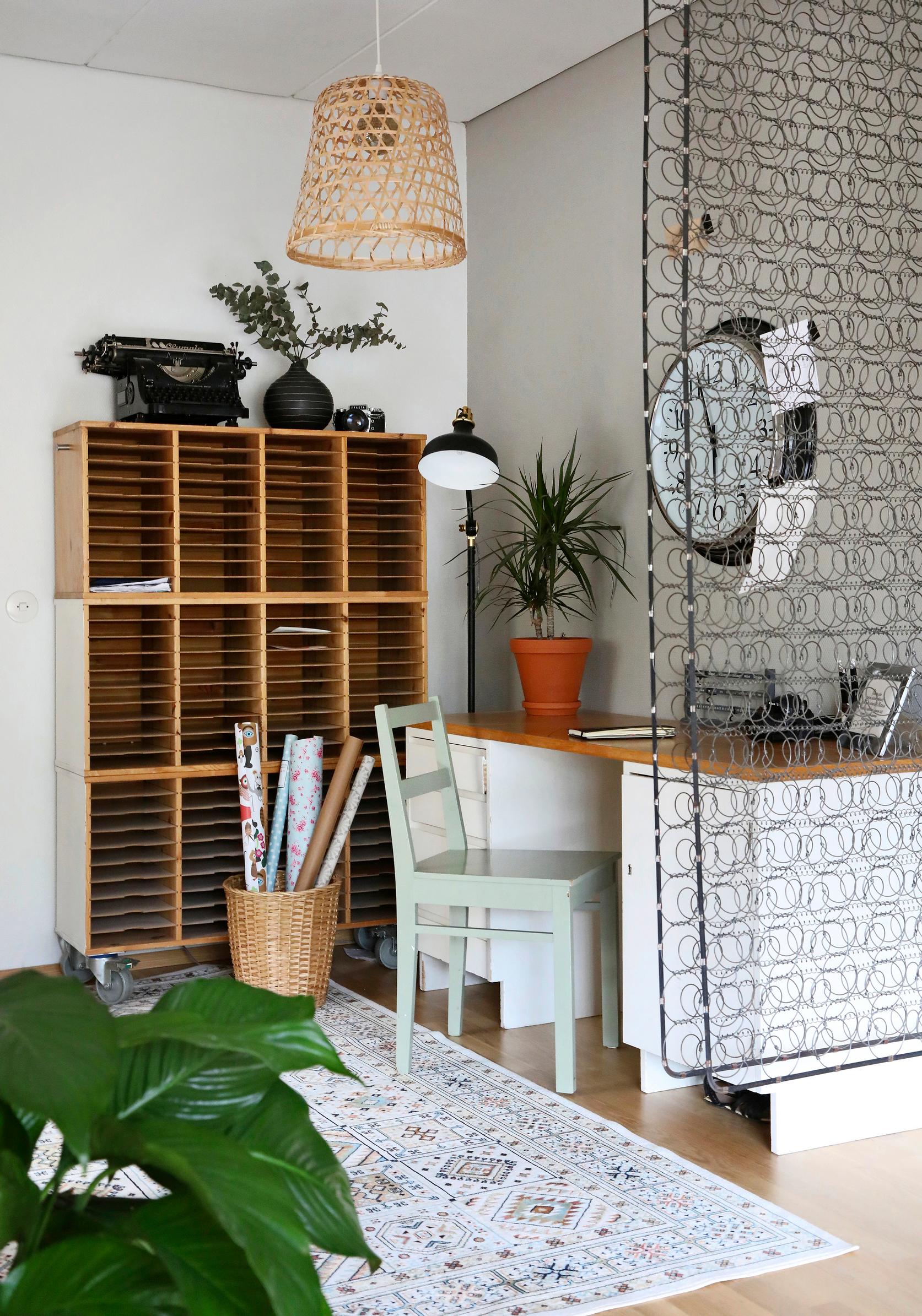 Riikka ja Tuukka sisustivat 1960-luvun talon kirppisaarteilla ja tee itse -meiningillä. Edellisiltä asukkailta ostettu, patjasta esiin kuorittu jousiosa on ilmava tilanjakaja, johon voi ripustaa muistilappuja ja muuta tärkeää.