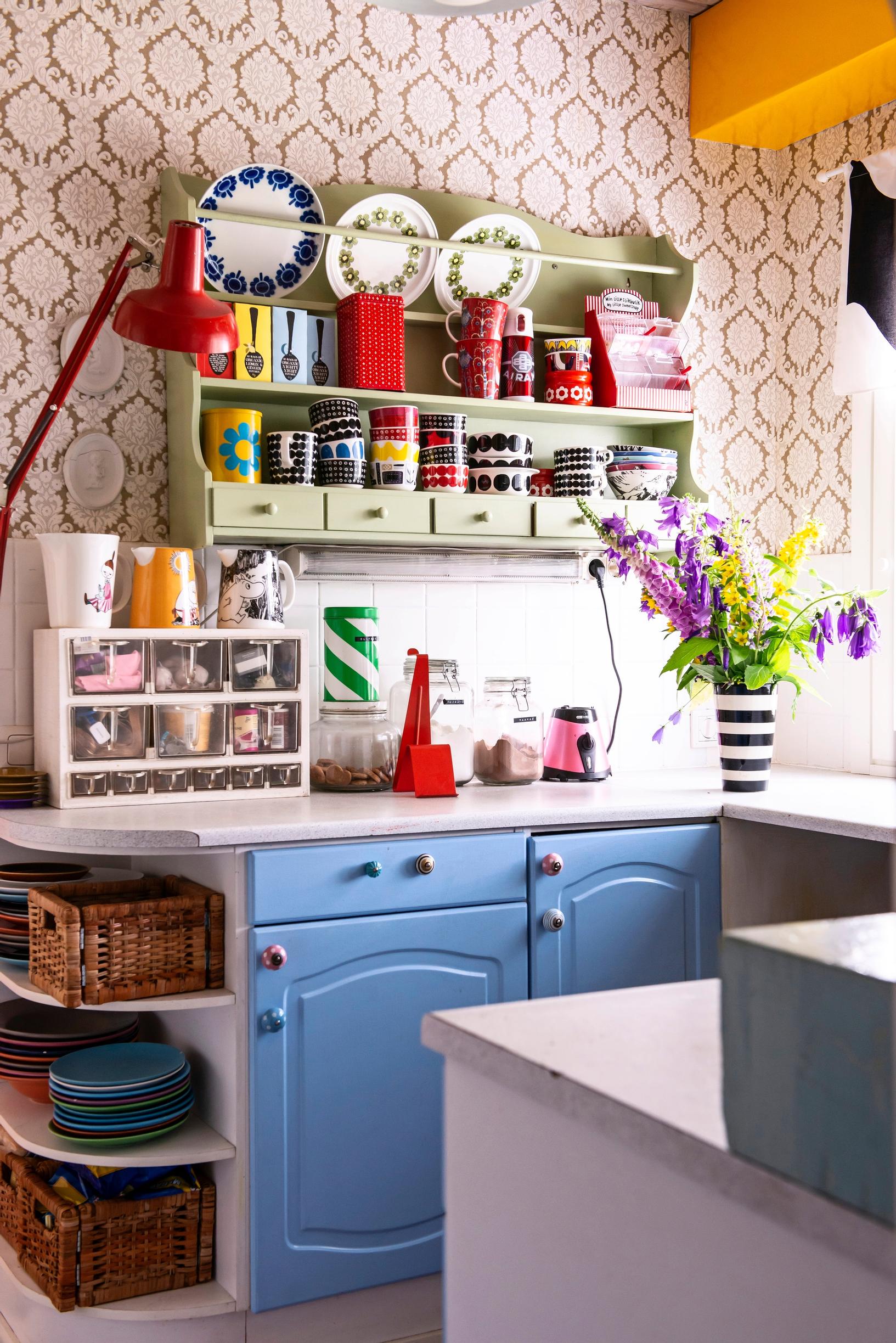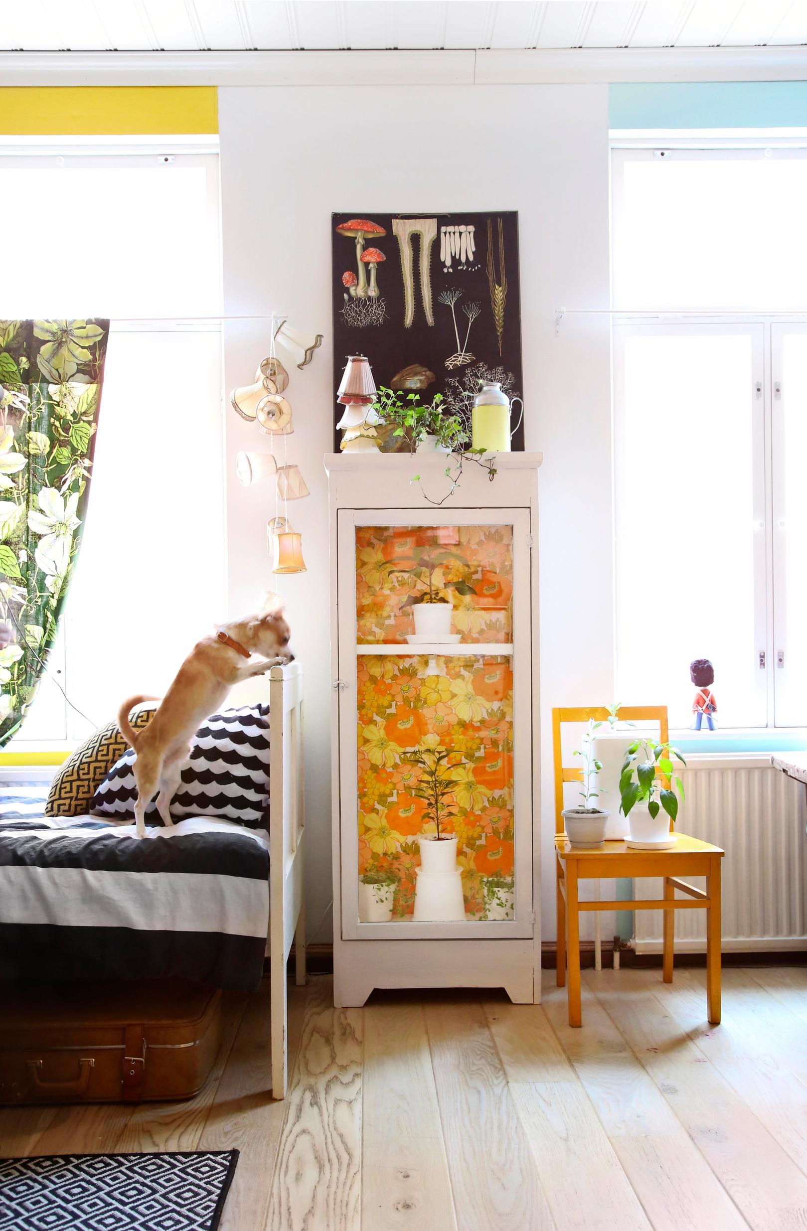 Milonan värikkäässä puutalokodissa siro kaappi sai takaseinälleen iloisen retrotapetin.