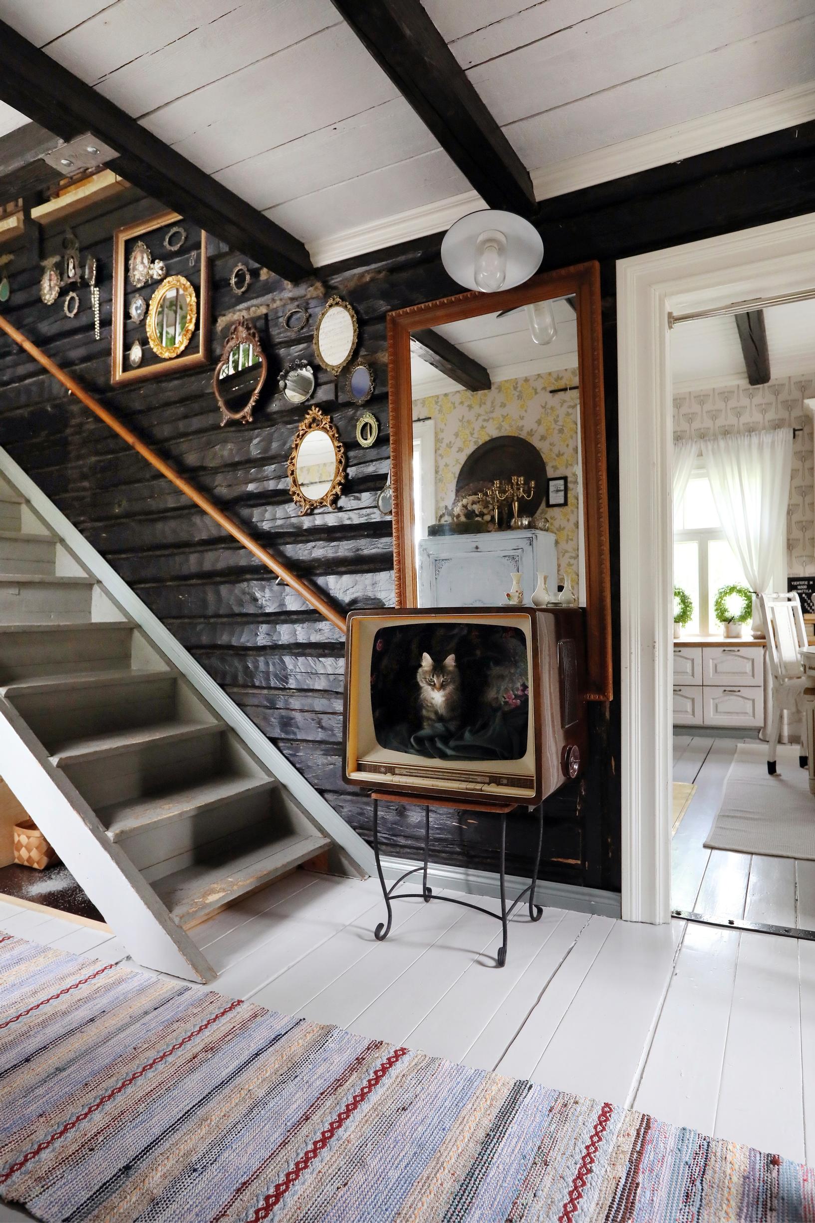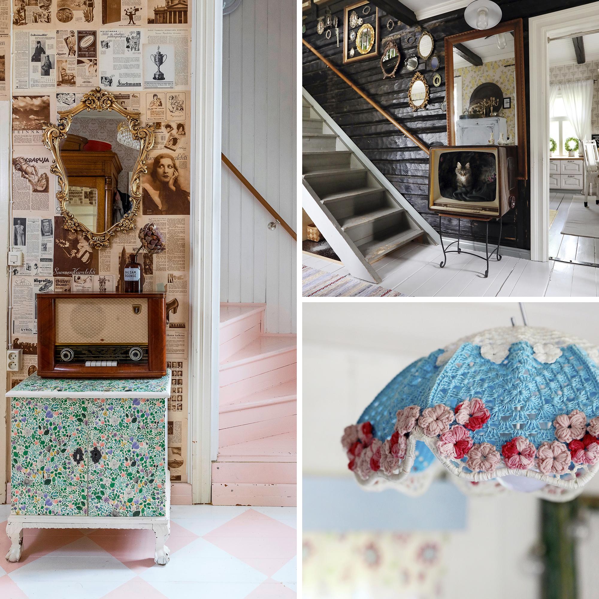 Anu Pensolan talon tunnelma on kuin Huvikummusta. Anu tapetoi portaat värikkäiksi. Tapetteja oli jäänyt varastoon aiemmista projekteista.