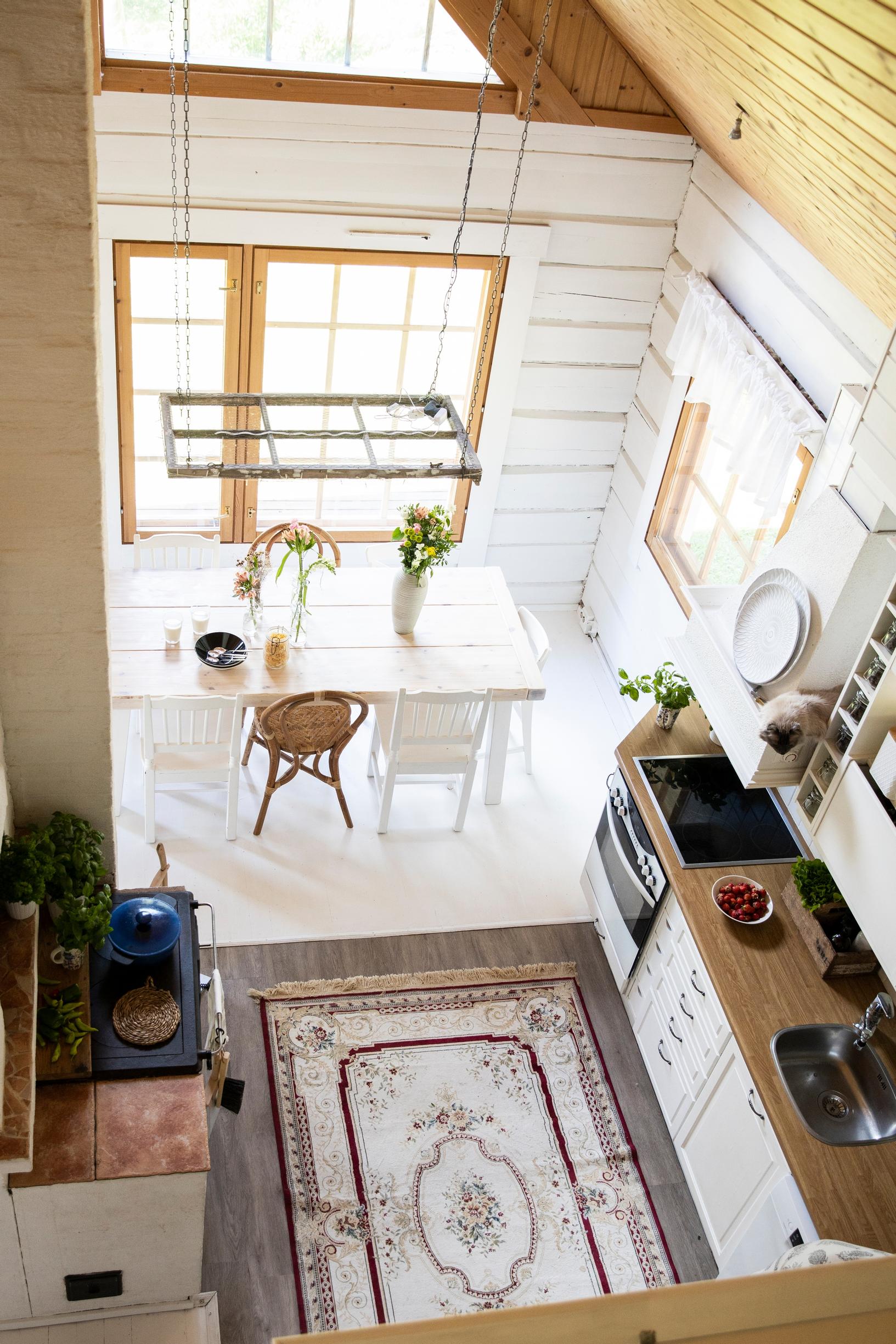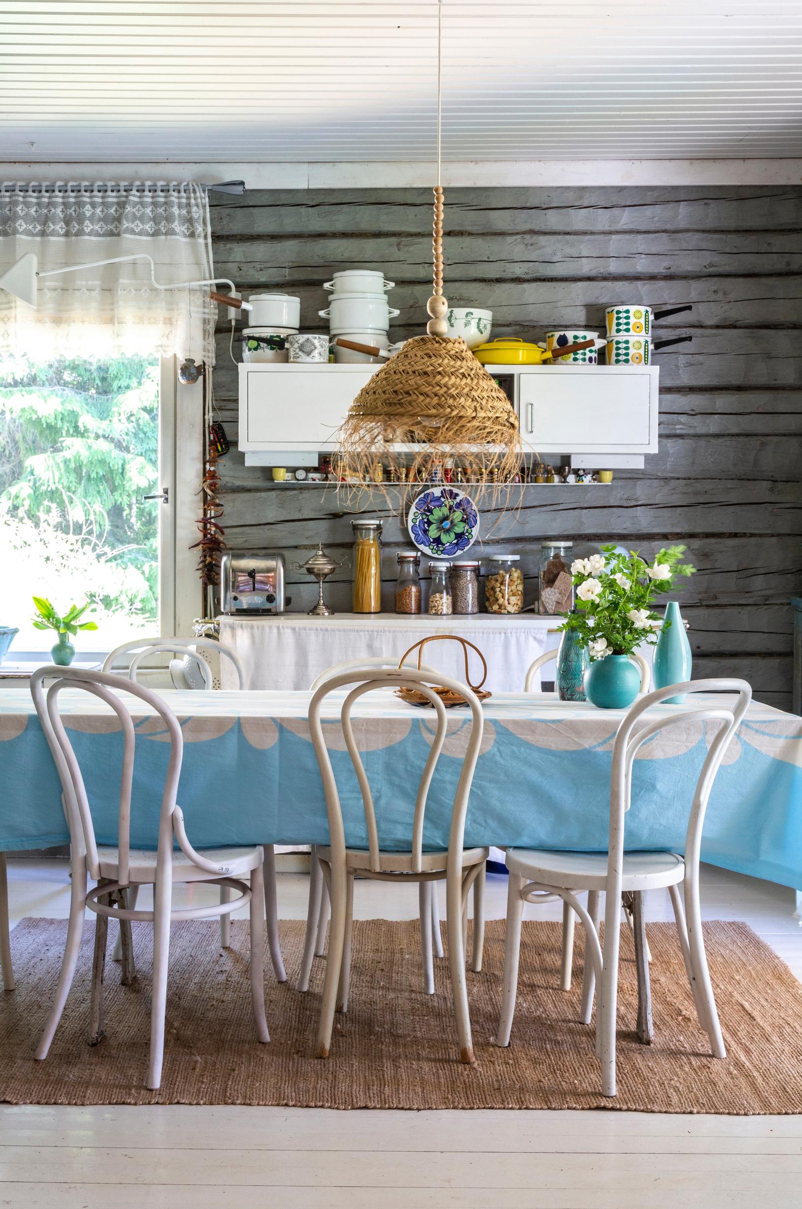 2000-luvun alun hirsitalo raikastui vaaleaksi Sonian ja Maxin käsissä. Jotta keittiön korkea tila ei näyttäisi ylenpalttisen avaralta, pari asensi ruokapöydän päälle vanhan ikkunan. Ketjut on kiinnitetty silmukkaruuveilla kattoon.