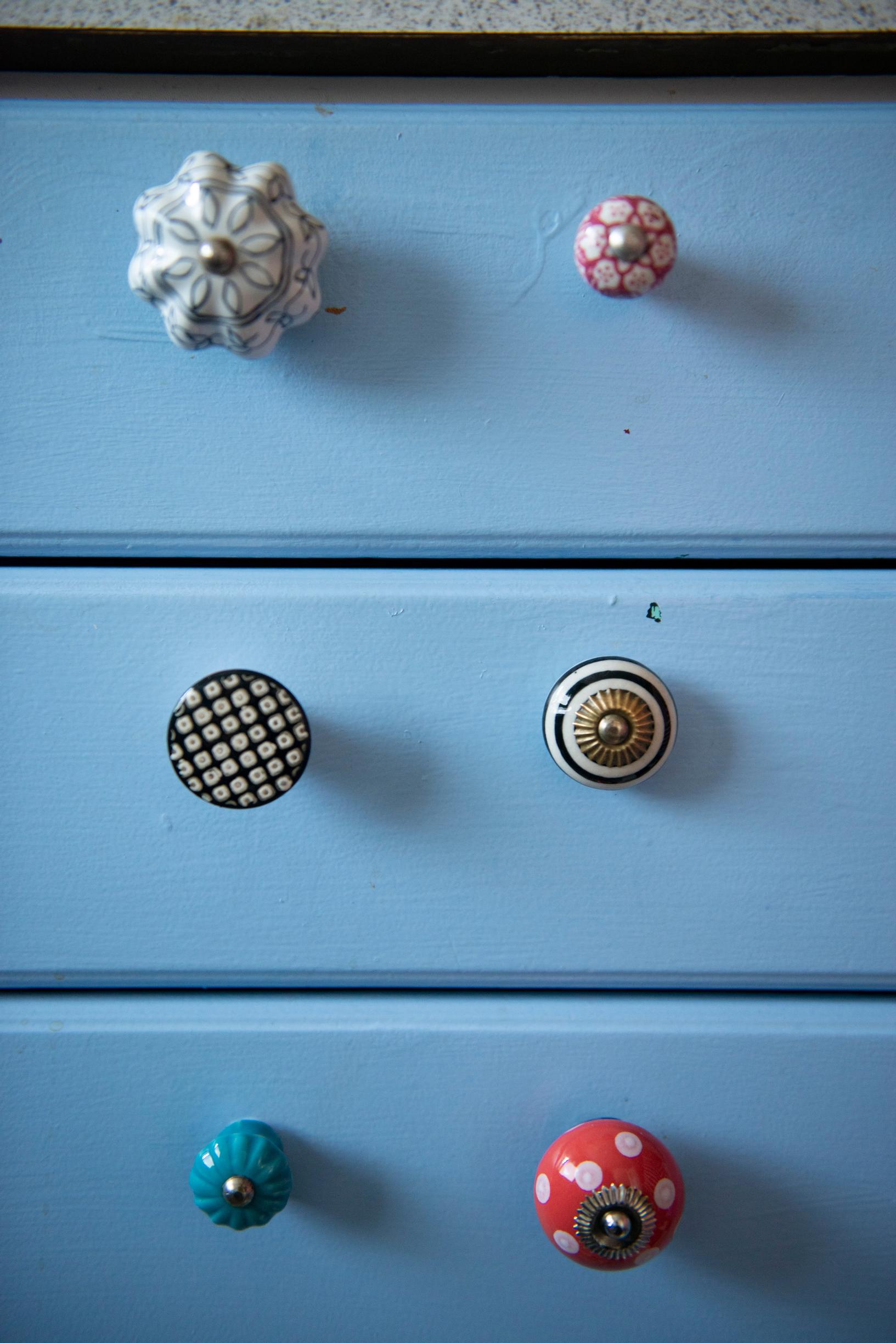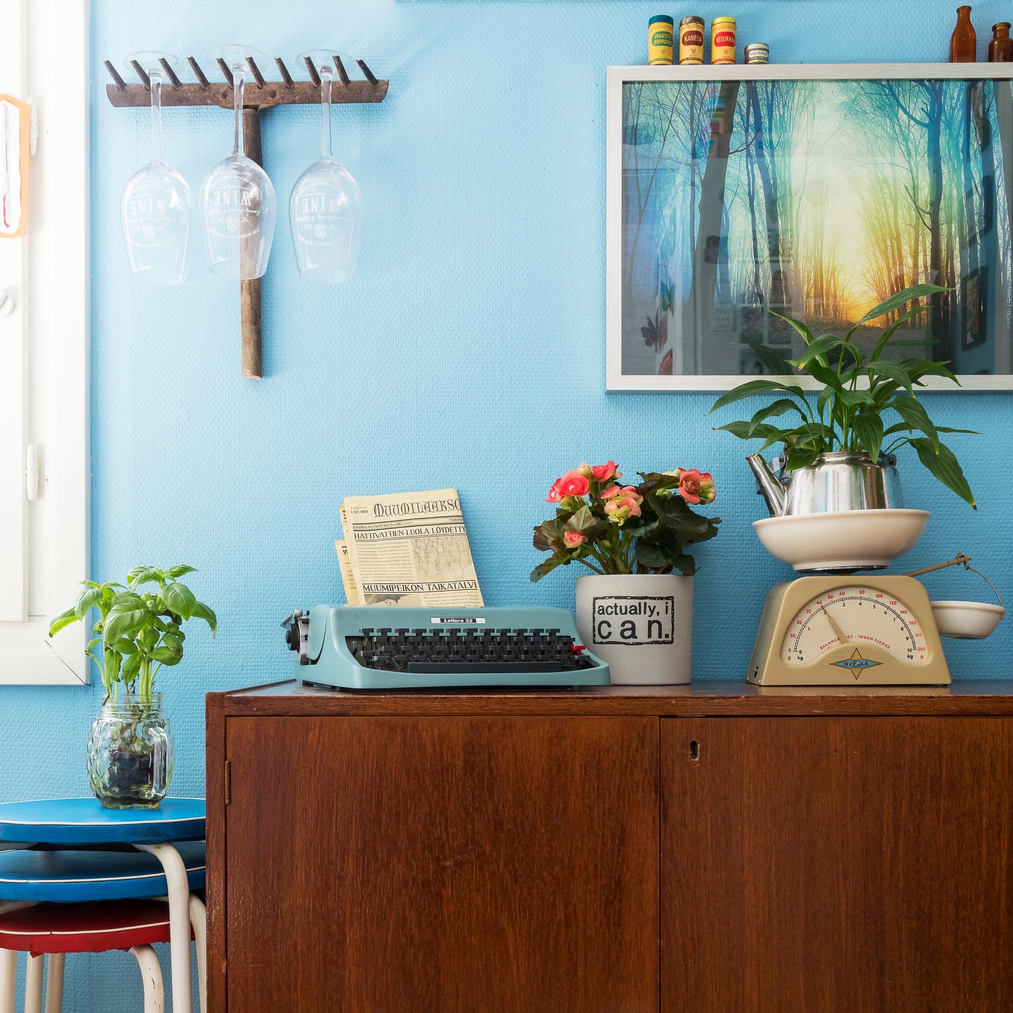 Iinan ja Tanelin huvikumpu on sekoitus värejä ja eri vuosikymmeniä. Iina tuunasi kaapin paperilautasliinoilla ja decoupage-lakalla, ja sen ilme muuttui kertaheitolla.