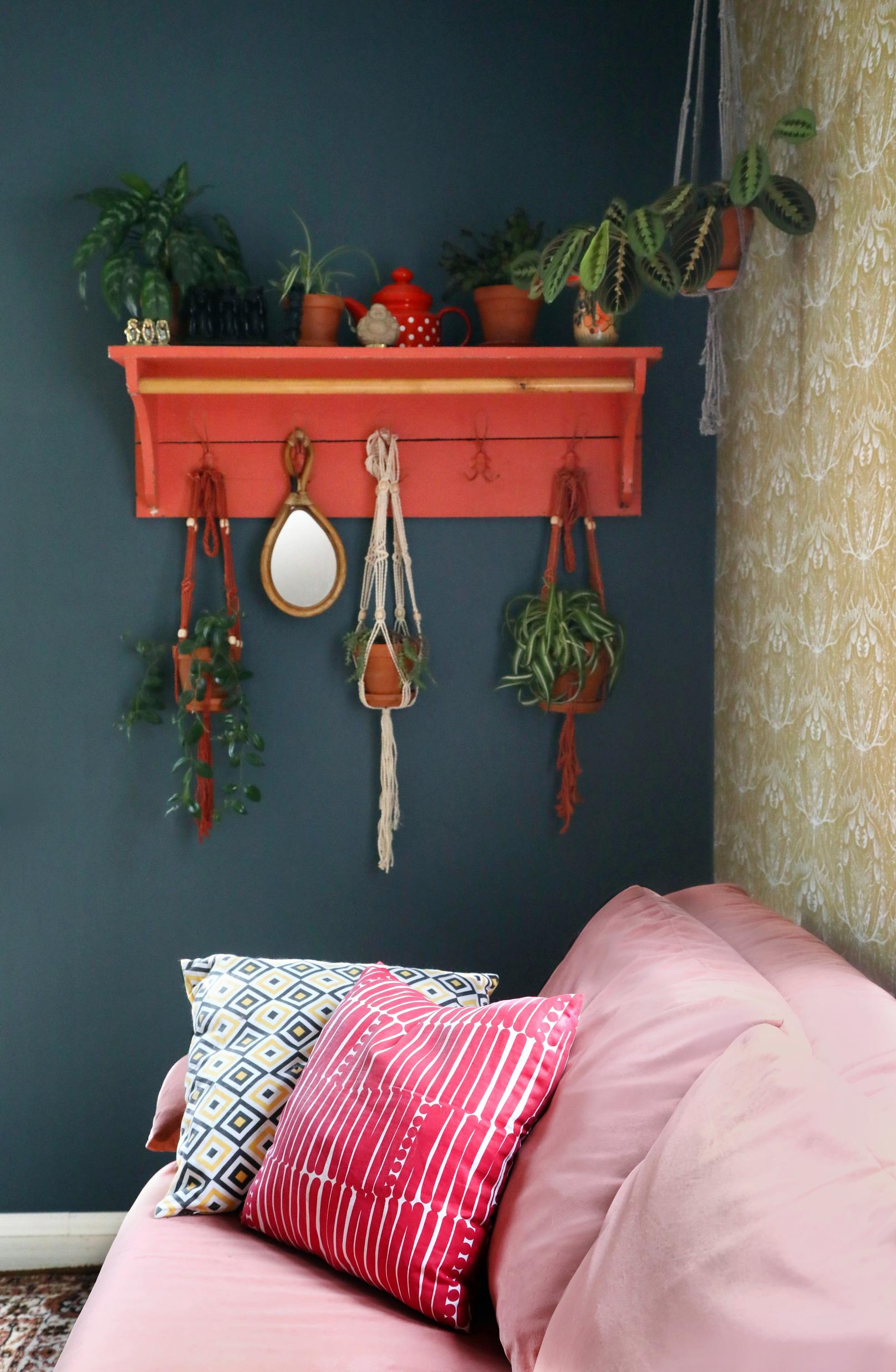 Annika näki kerran Pinterestissä kuvan naulakosta, jossa roikkui amppeleita. Hän sovelsi ideaa kodissaan kaverilta saatuun hattuhyllyyn.
