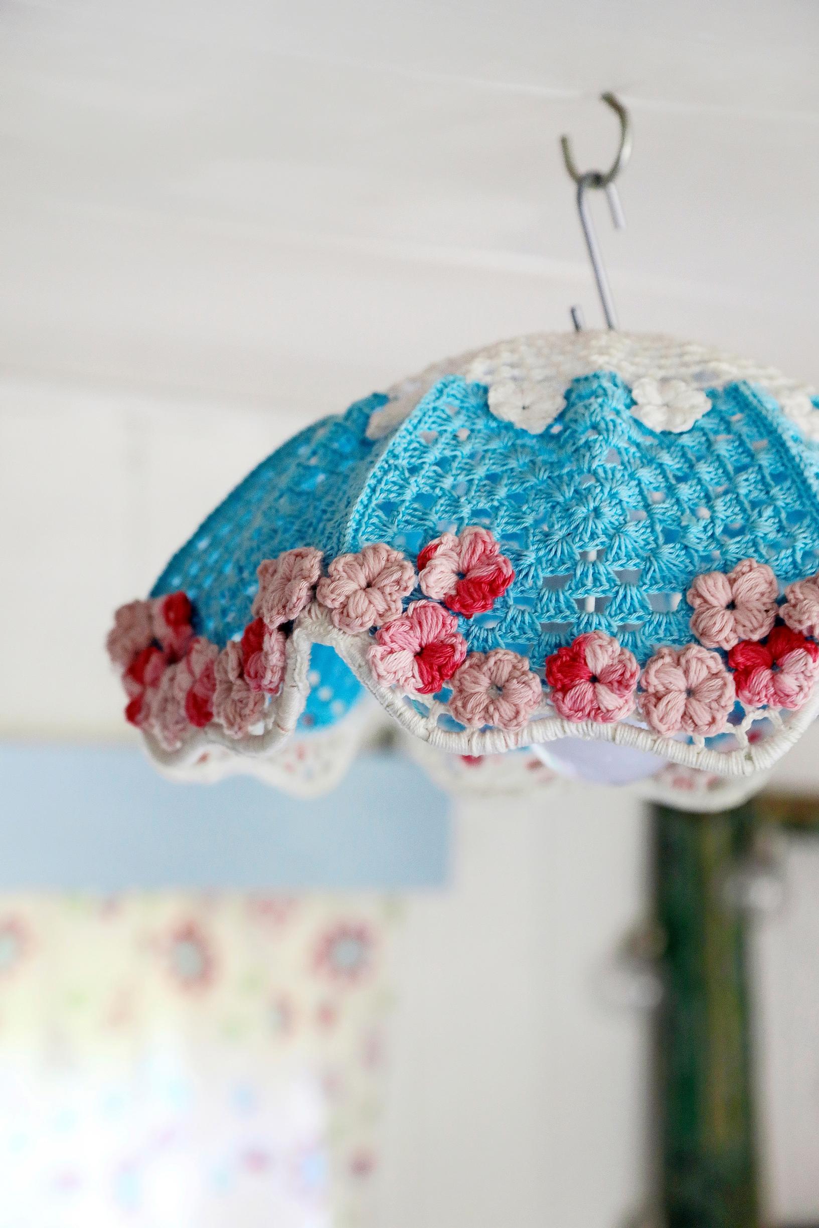 Heini on virkannut kesämajaansa kukkavarjostimen Unelmien Talo&Kodin ohjetta mukaillen ja valinnut siihen mökkiin sopivat värit.