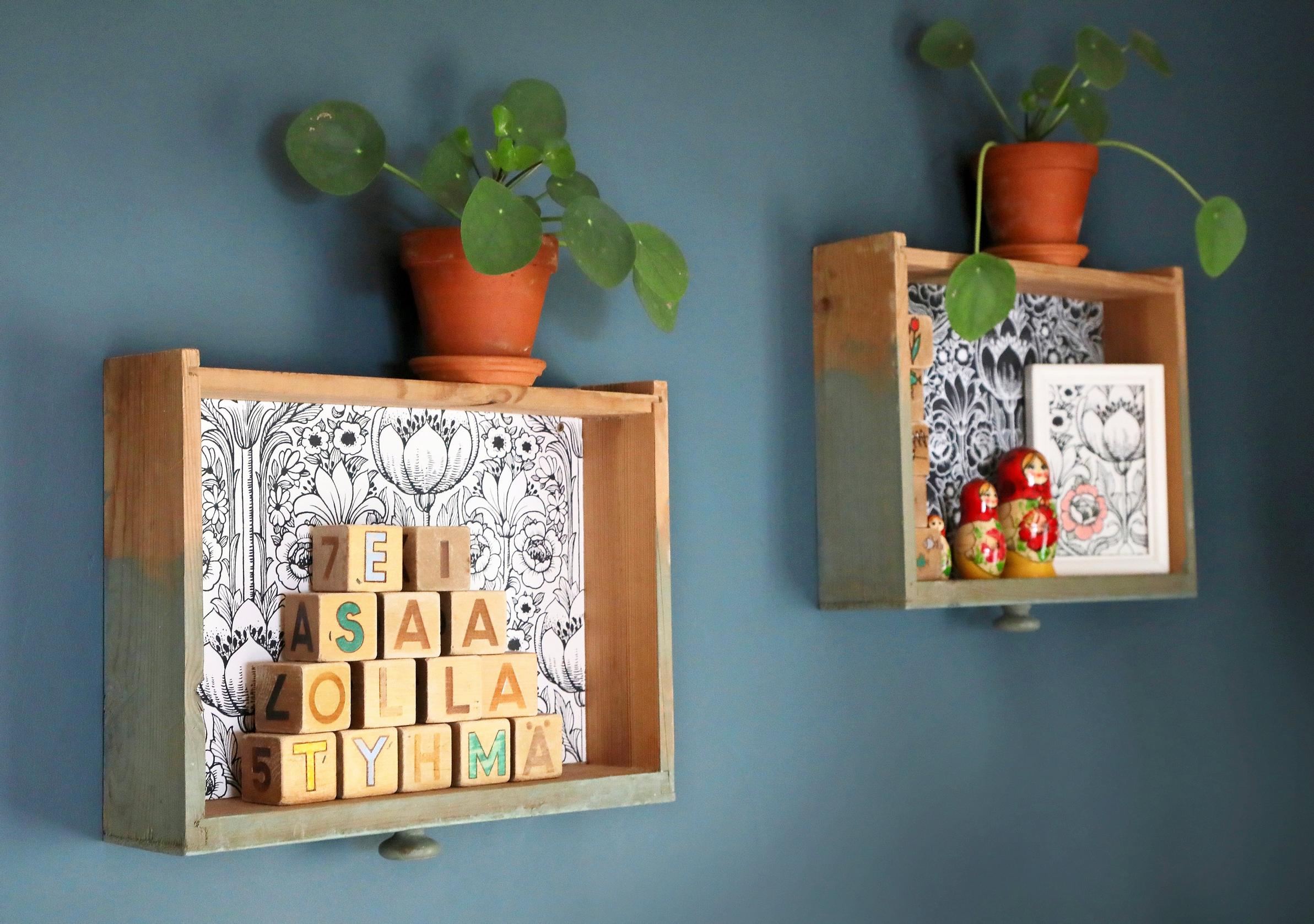 Annika on kunnostanut vanhasta omakotitalosta hyvän mielen kodin vähällä rahalla ja paljolla kekseliäisyydellä. Vanhoista piironginlaatikoista tuli hauskat pikkuhyllyt. Laatikoiden pohjat kaunistuivat tapeteilla.