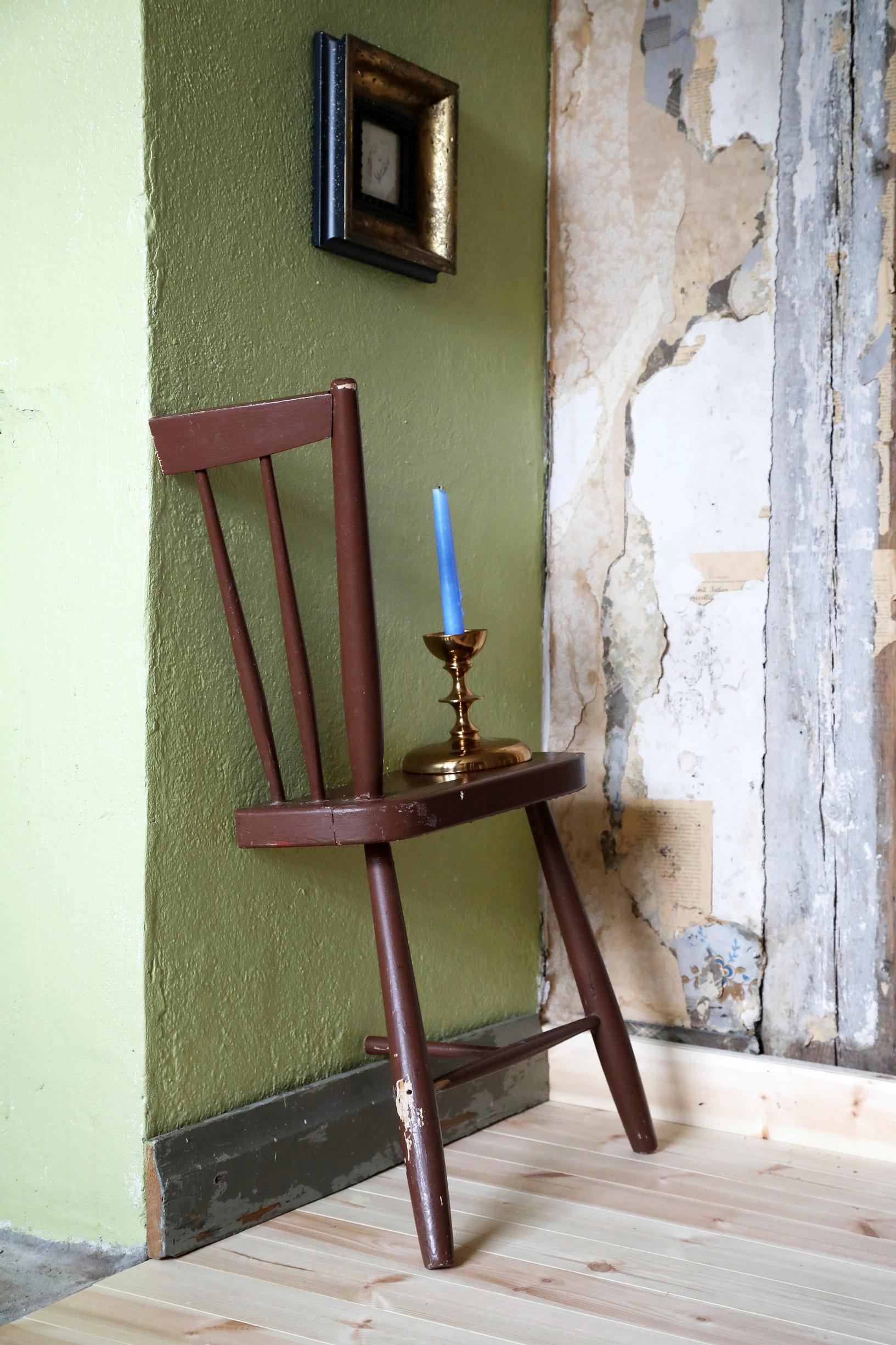Seinään uponnut tuoli toimii söpönä pikkupöytänä