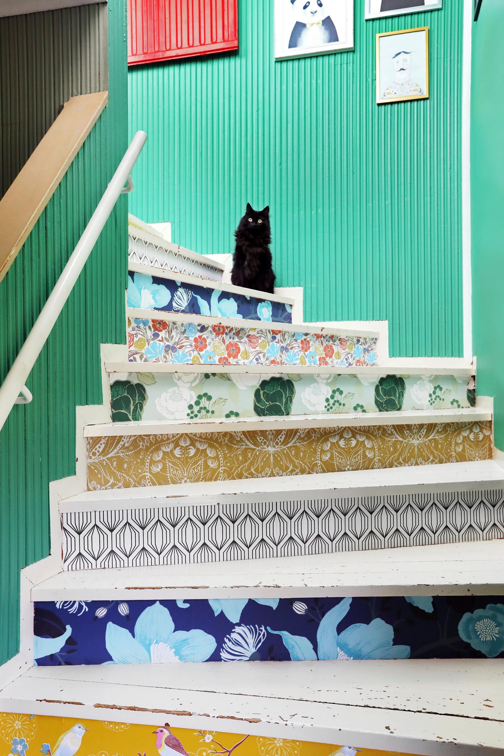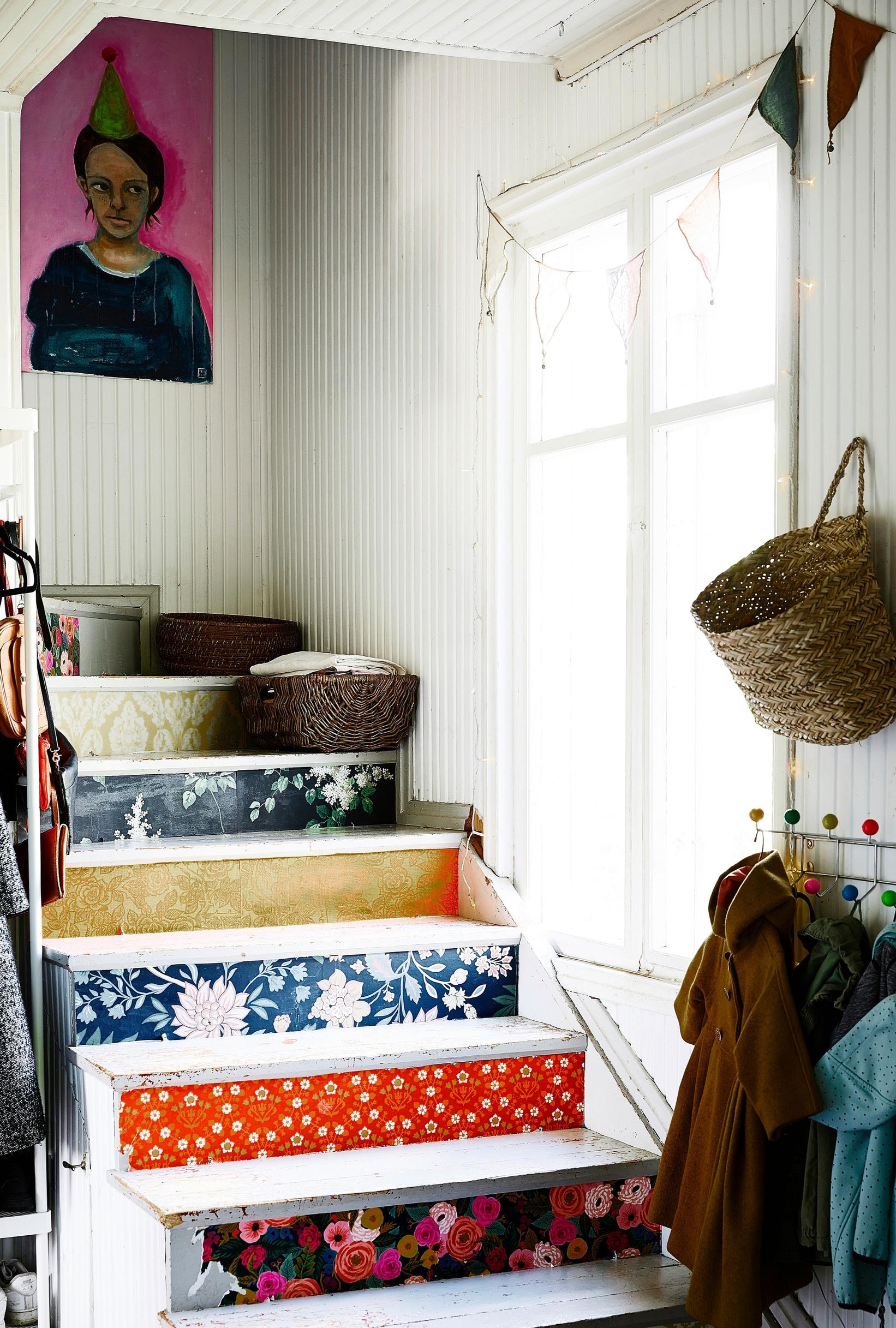 Annika aloitti kotitalonsa portaikon tuunauksen liisteröimällä askelmien pystyosiin paperilautasliinoja, mutta lopputulos ei ollut ihan toiveiden mukainen. Niinpä hän irrotti paperit ja vaihtoi tapetteihin aina, kun löysi tai sai riittävän pitkän pätkän.