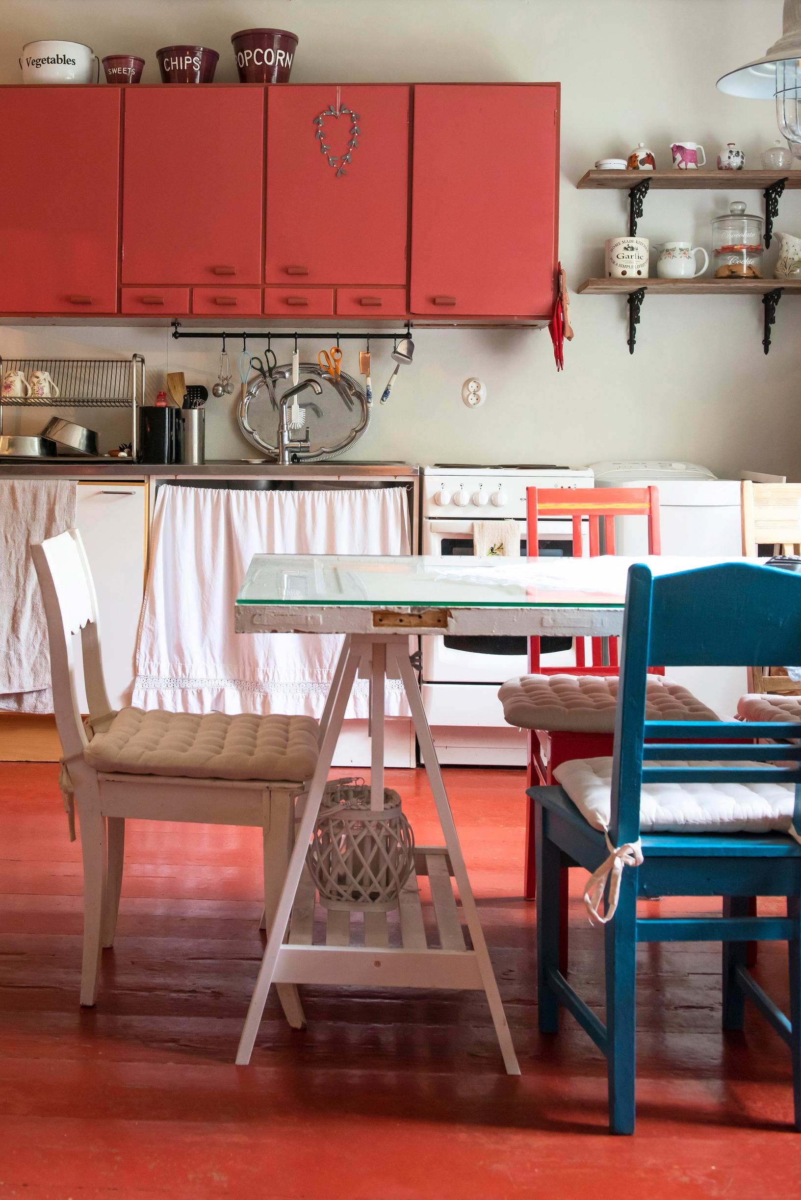 Petra ja Janne ovat remontoineet Petran lapsuudenkodista iloisen ja yllätyksellisen asuinpaikan perheelleen. Keittiön kaapit ovat alkuperäiset kolmenkymmenen vuoden takaa. Ne saivat jatkoaikaa maalilla. Hilpeä yksityiskohta on kaappien eripariset vetimet.