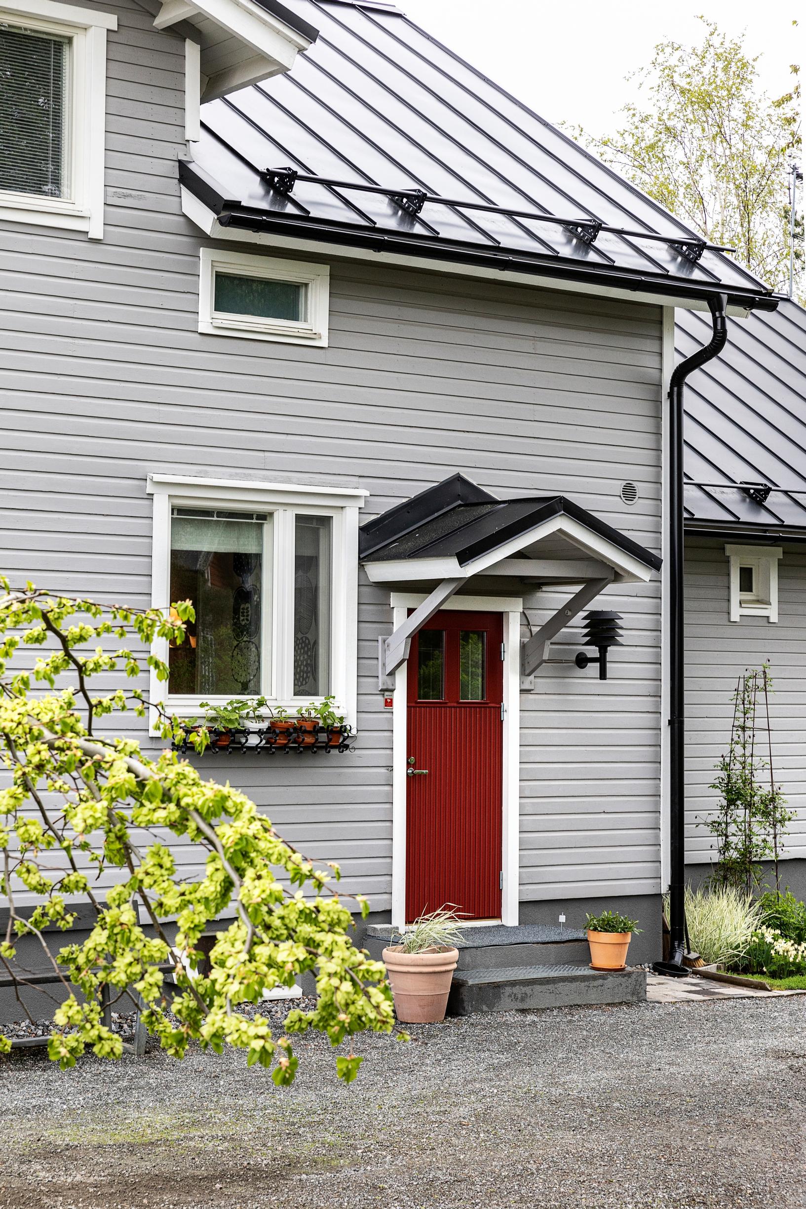 Talon julkisivu oli muuttaessamme kellertävä ja maalasimme sen harmaaksi. Vanhaa maalia rapsutellessamme esille tuli useita eri sävyjä, kuten räikeänvihreää – kaikuja menneisyydestä!