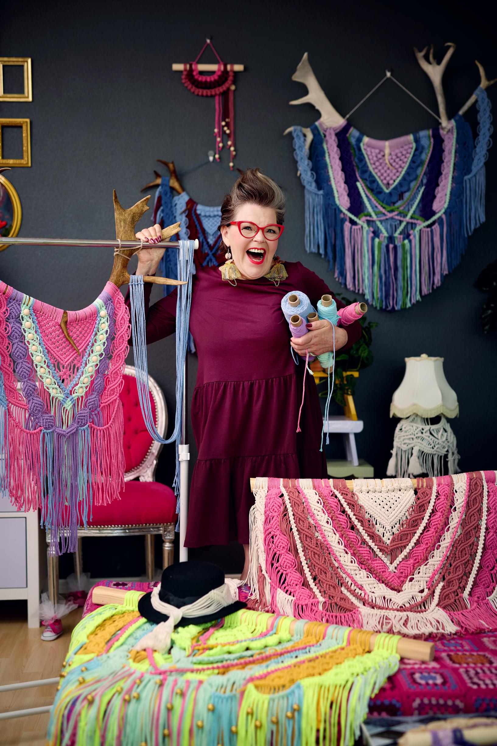Olen tehnyt 1500–2000 makrameetyötä. Kodissani on joka huoneessa makrameita, yhteensä reilut viisikymmentä. Tekeminen tuntuu aivan ihanalta. Saatan viettää jopa 14 tuntia putkeen yhden työn parissa. Musiikki soi taustalla, eikä minua väsytä yhtään.