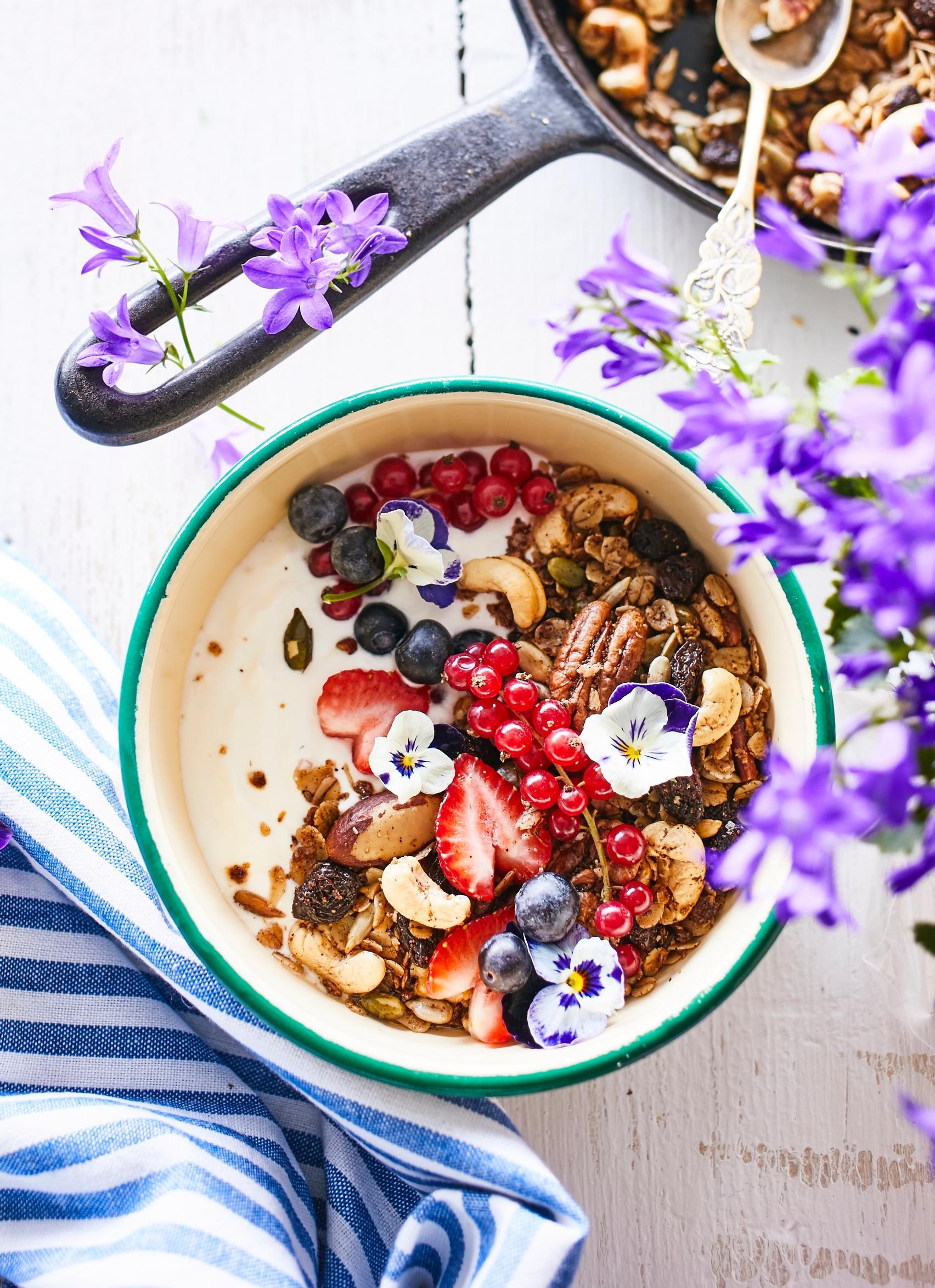 Jogurtin päälle ripoteltu granola on sopivan tuhtia, kun se sisältää reilusti pähkinöitä ja siemeniä. Kurkkaa gluteeniton granola, joka valmistuu paistinpannulla muutamassa minuutissa!