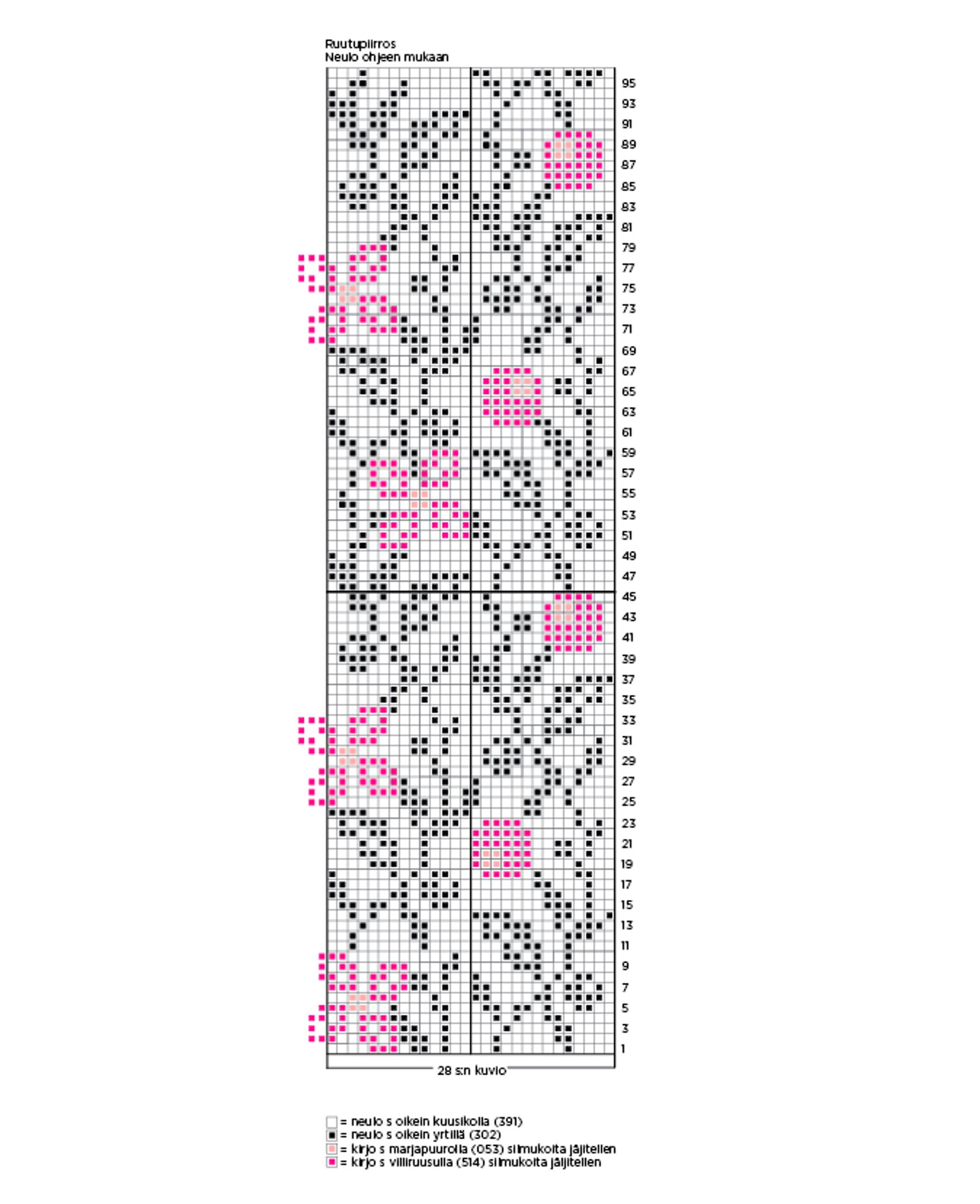- Aloita kirjoneule ruutupiirroksen 1. kerrokselta ja toista 28 s:n mallikerta 2 kertaa. Neulo kerrokset 2–45. Huom! Neulo kukkien kohdalla s:t kuusikolla.