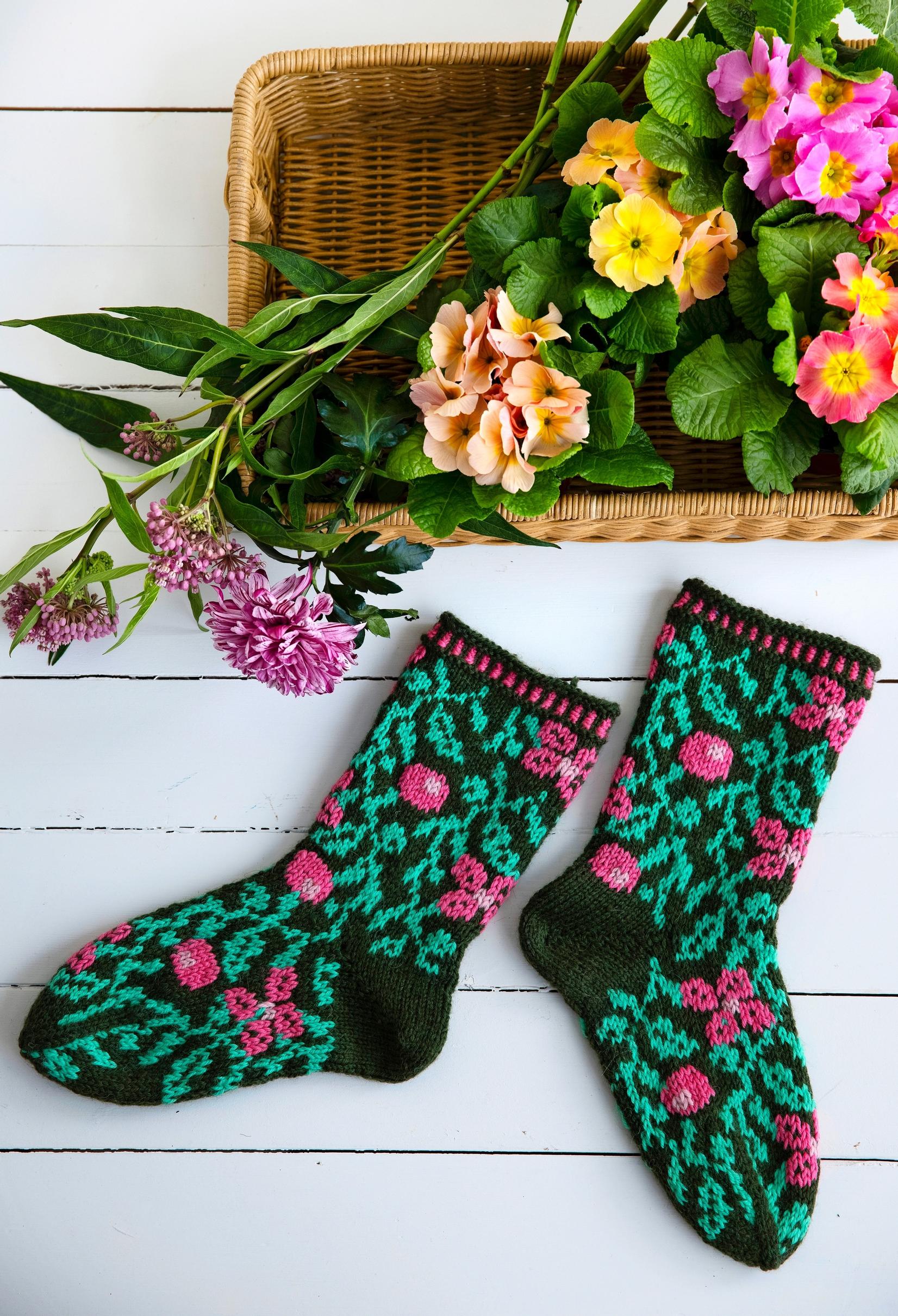 Näissä suloisissa villasukissa kukkii ikikesä. Köynnöskukkasukat neulotaan kolmella värillä. Neljättä käytetään viimeistelyvaiheessa, kun kukat silmukoidaan valmiiseen sukkaan.