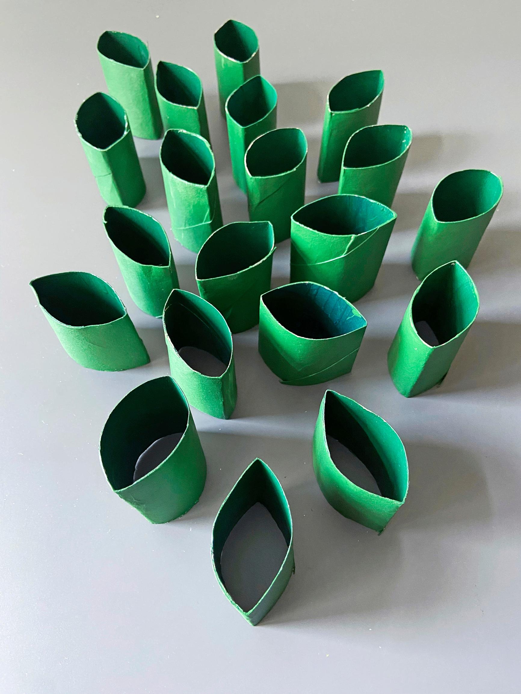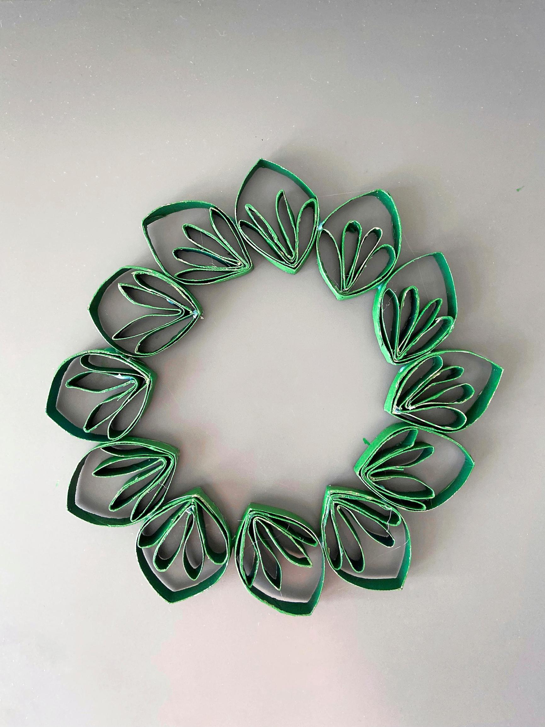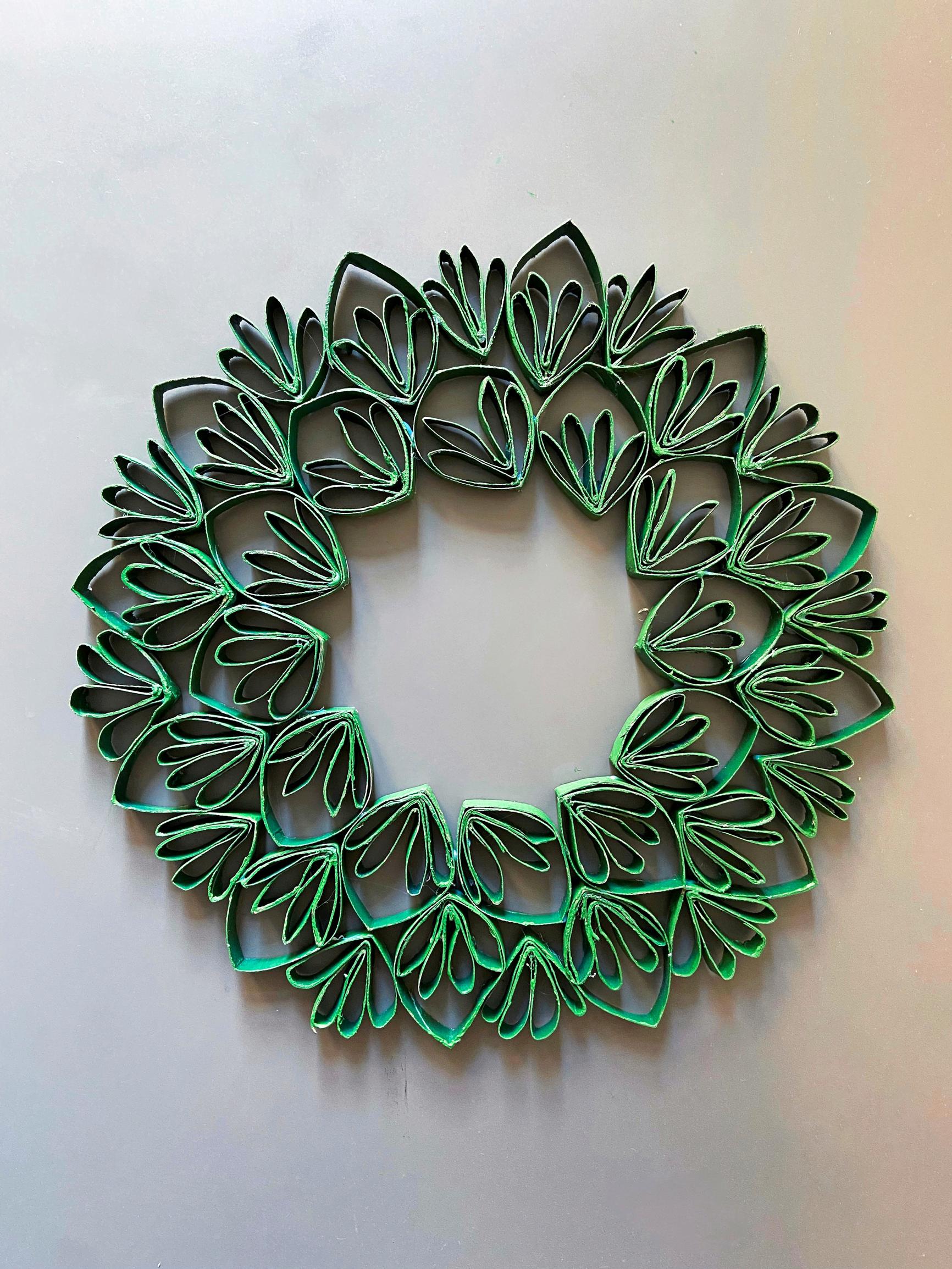 1. Leikkaa 21 cm pitkät pahvihylsyt pystysuunnassa kahtia, 10- ja 11-senttiksi rulliksi. Käytä valmiita sävyjä tai sekoita vihreistä maaleista kaksi sopivaa, tummempi ja vaaleampi havuinen sävy. Maalaa rullien sisäpinnat tummemmalla ja ulkopuolet vaaleammalla sävyllä ainakin kolme kertaa. Anna maalin kuivua välillä. Maali kovettaa pahvia ja estää valmiin kranssin venymistä.