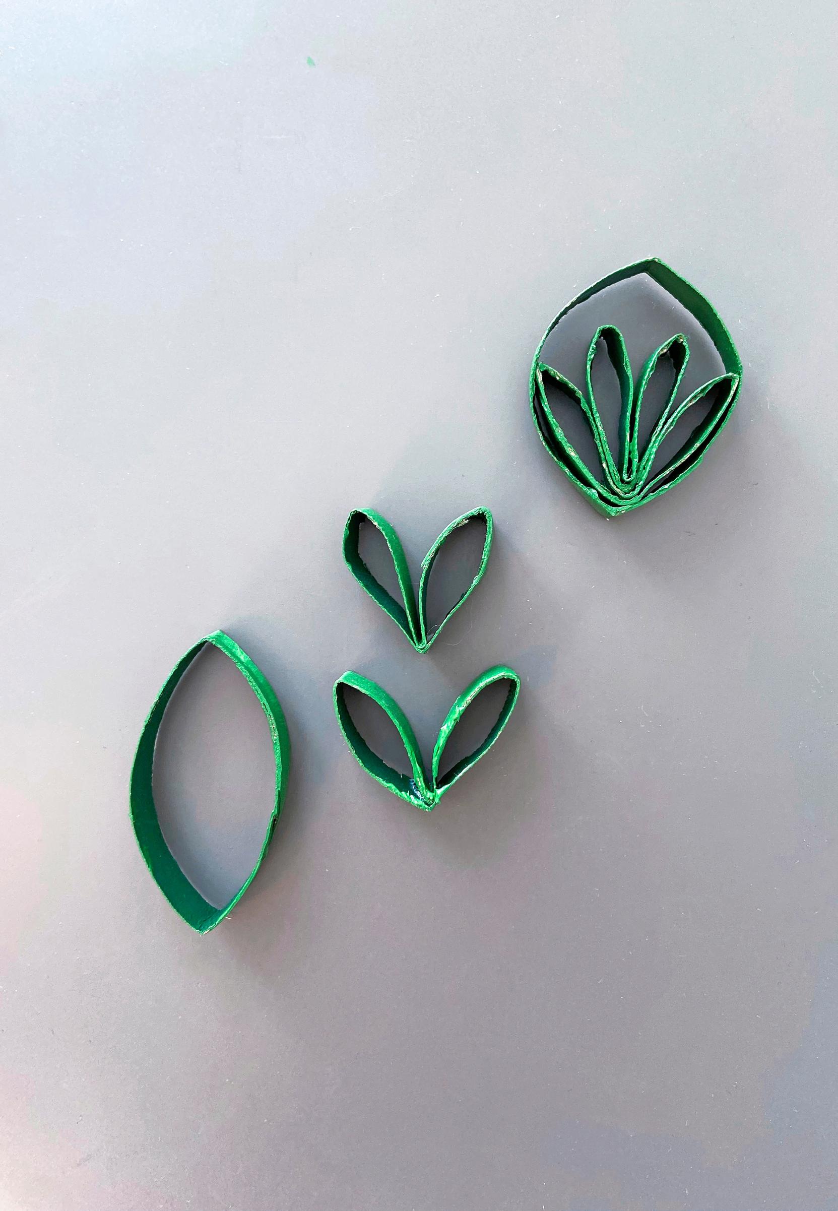 3. Taita leikkaamistasi renkaista terälehtiä. Jätä 24 kappaletta terälehden muotoon ja taita loput vielä kahtia niin, että saat sirkkalehtiä. Liimaa sirkkalehtien tyvet niin, ettei kuvio aukea. Liimaa sitten kaksi sirkkalehtipalaa terälehden sisälle. Kokoa näin 24 kuviota. Jos kuvioiden reunojen leikkausjäljet eivät ole maalin peitossa, tuputtele niihin rullien ulkopuolelle käyttämääsi maalia. Anna maalin kuivua kunnolla.