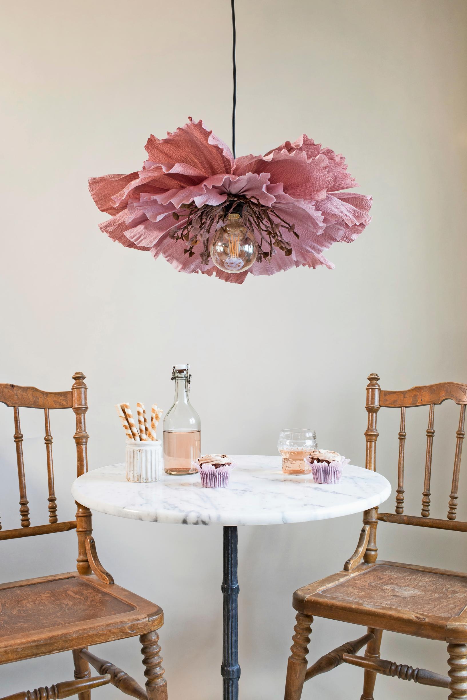 Näyttävä kukkavalaisin syntyy yllättävän helposti kreppipaperista. Lisäksi tarvitset led-polttimon ja lampun johdon.