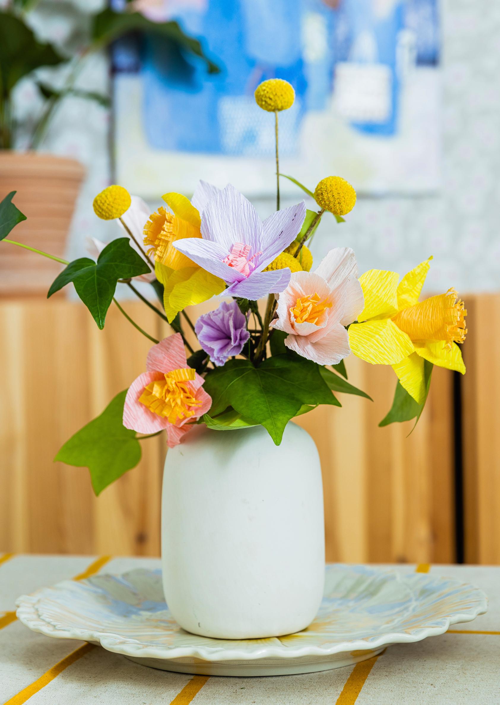 Kreppipaperikukat koristelevat kodin pääsiäiseen – iloisen värinen ikikimppu syntyy vain parista tarvikkeesta