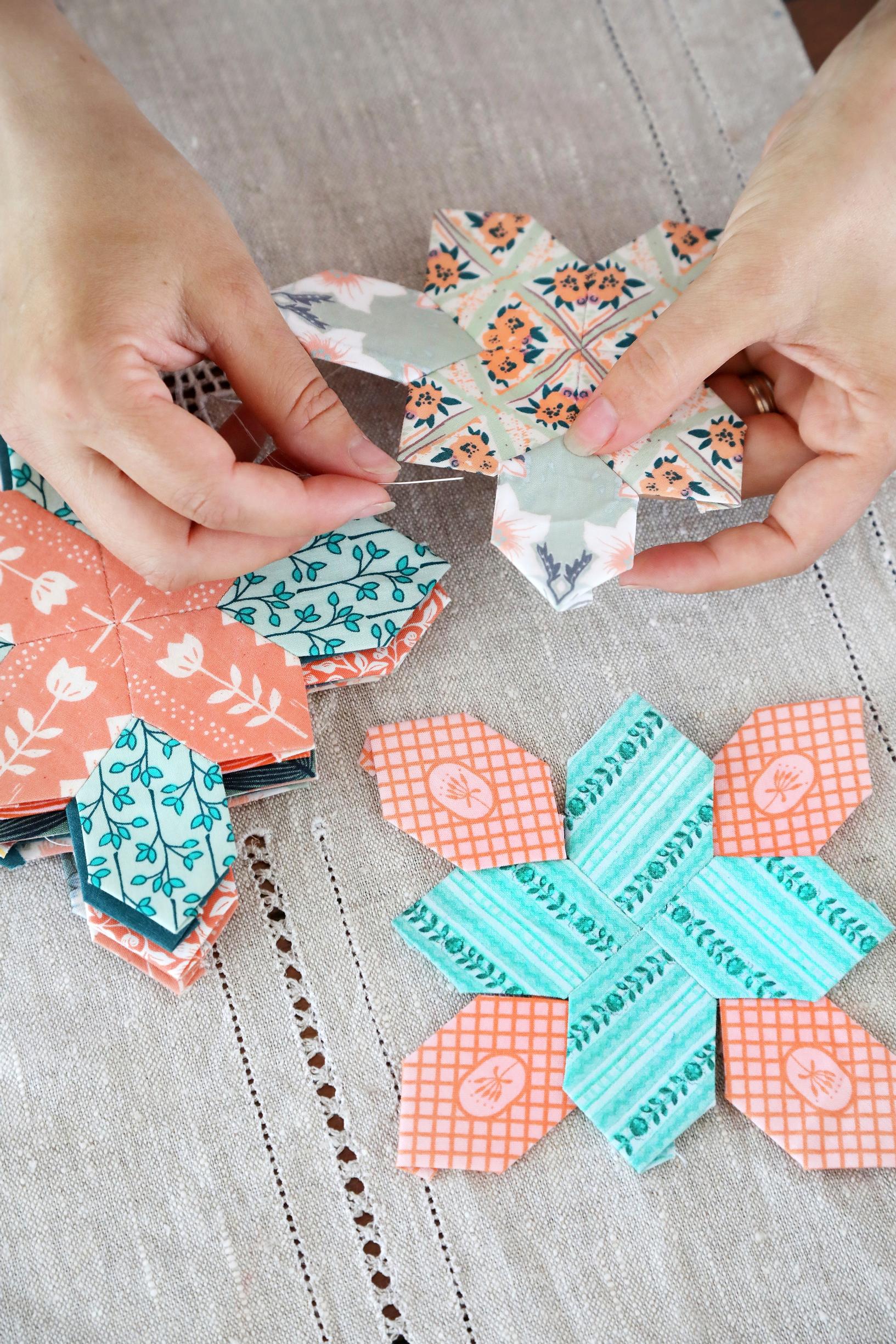 Kun iltatähtemme syntyi, tutustuin syvemmin käsinompeluun. Tiesin, että vauvan kanssa varsinkin ompelukoneaika olisi rajallista. Käsin voi kuitenkin ommella missä vain: autossa, lapsen viihtyessä lattialla, telkkarin ääressä, vastasyntyneen nukkuessa sylissä. Blokkien tekeminen ei juuri vie tilaa, ja työt etenevät pikkuhiljaa.