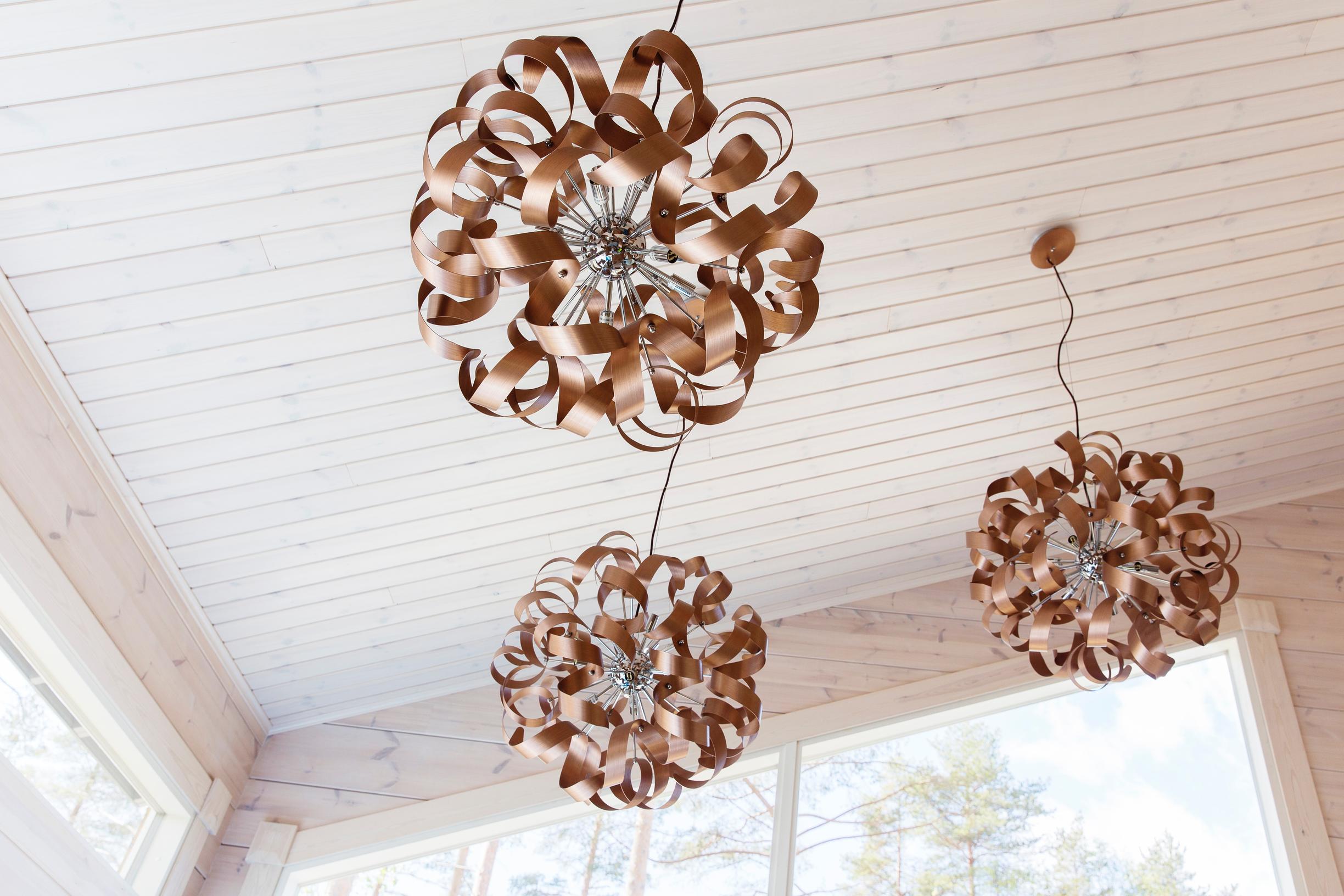 5. Korkeat olohuoneet ovat usein meille suomalaisille vaikeita sisustaa. Nautimme avaruudesta mutta emme kuitenkaan osaa korostaa ja tuoda sitä esille. Luciden kuparin väriset Atoma-valaisimet vetävät vääjäämättä katseen korkeusiin hirsilinnan vaaleassa olohuoneessa. Vasta ne tuovat huonekorkeuden oikeuksiinsa.