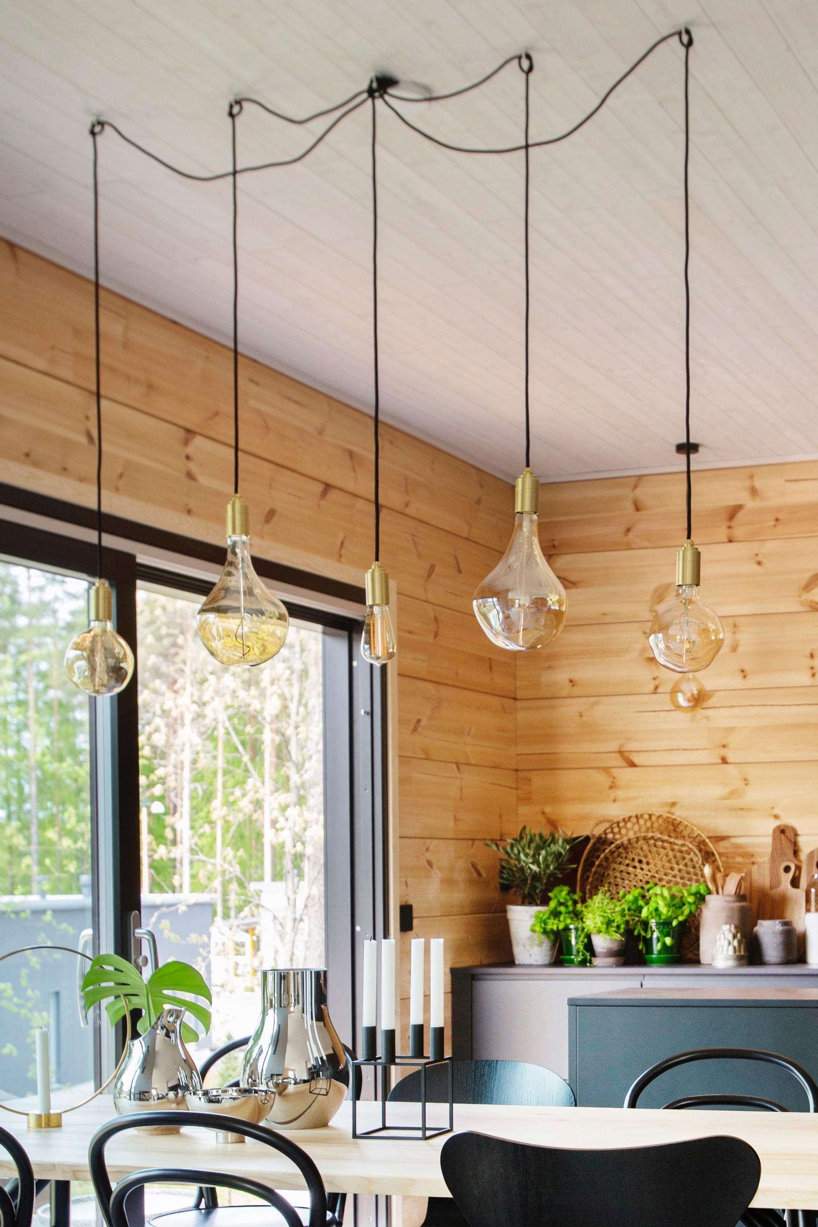 2. Talan Voronoi -ledipolttimoista ja johtosarjoista koostuva valaisin on yhtä aikaa vaatimaton ja ylellinen, simppeli ja monimuotoinen. Siksi se sopii loistavasti rouheaa ja linjakasta yhdistävän hirsitalon ruokailutilaan. Myös talon värit musta ja lämmin mänty toistuvat siinä.