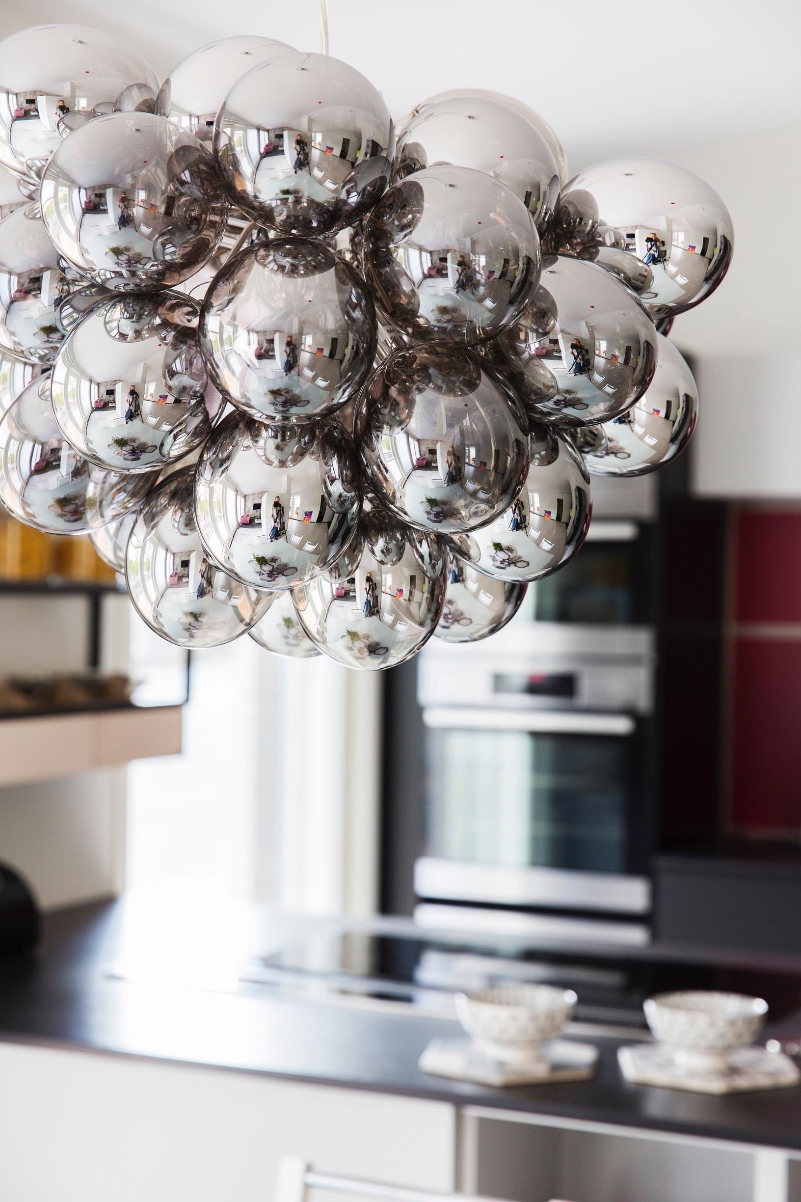 3. Valkoinen ruokailuryhmä olisi vaaleasävyisessä ruokailutilassa lähes huomaamaton, ellei sen päällä roikkuisi tämä hopeinen pilvi. By Rydénsin hypnoottinen Gross-valaisin merkkaa paikan erityiseksi ja kerää kaikkien huomion yhteen kohtaan. Sen valo on yllättävän lämmintä, sillä metalloidun pinnan olla on savulasia.