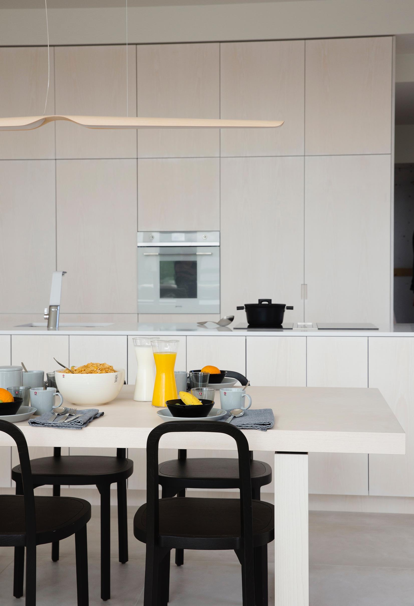 4. Minimalistinen sisustus vaatii selkeän ja ylvään valaisimen. Kotimaisen Tunton Swan-valaisin on juuri sellainen. Ilmassa leijuva vanerisiipi tuo kulmikkaaseen keittiöön sulavuutta. Käytäntökin pelaa: se valaisee tasaisesti koko pöydän eikä toisaalta peitä keittiössä hääräilevältä komeaa järvimaisemaa.