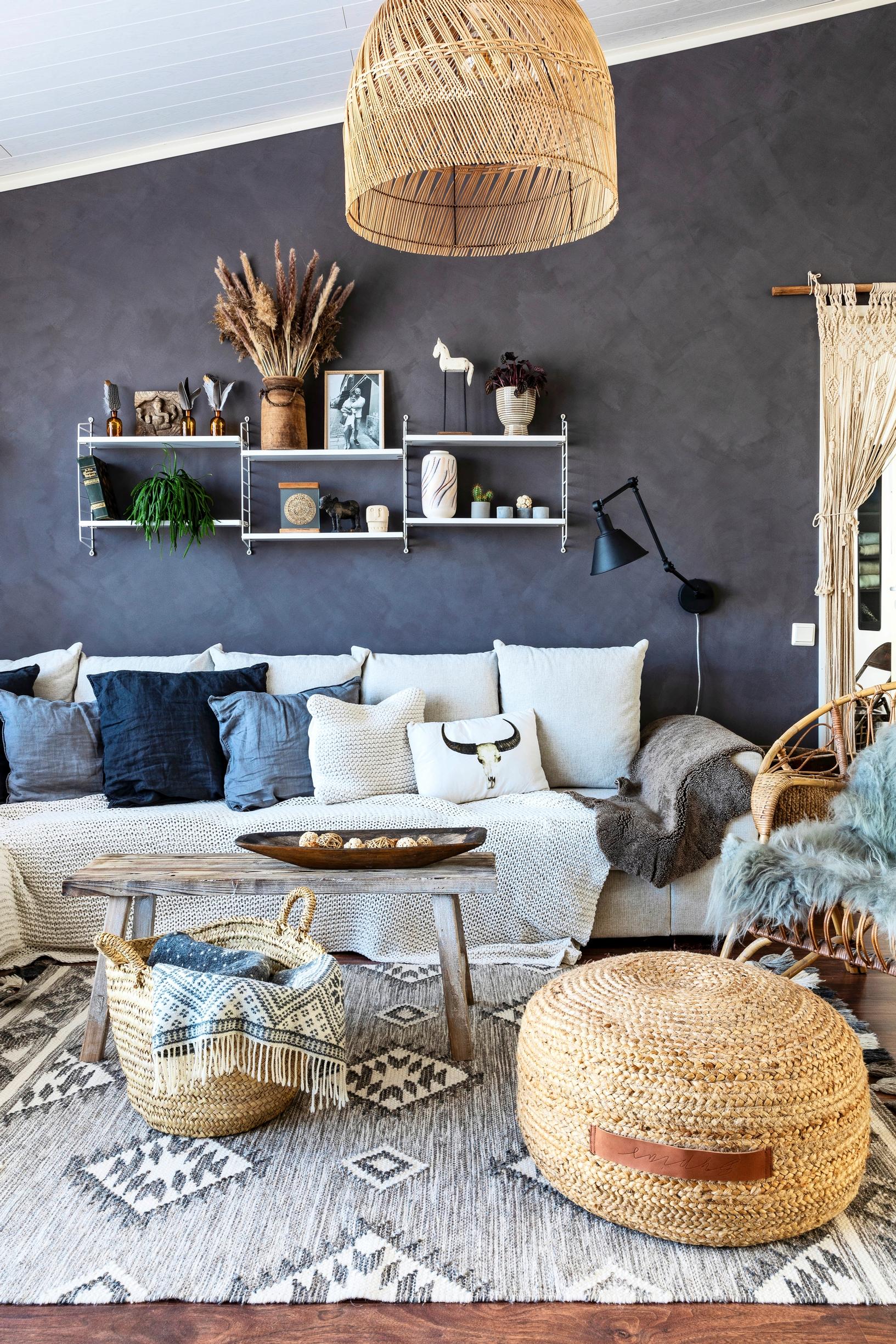 Kotona viihtyvät Jukka ja Kristi sisustavat boheemisti luonnonmateriaaleilla ja harkitun tyylikkäillä, tummilla sävyillä. Remonteissa pari luottaa maalaamisen voimaan.