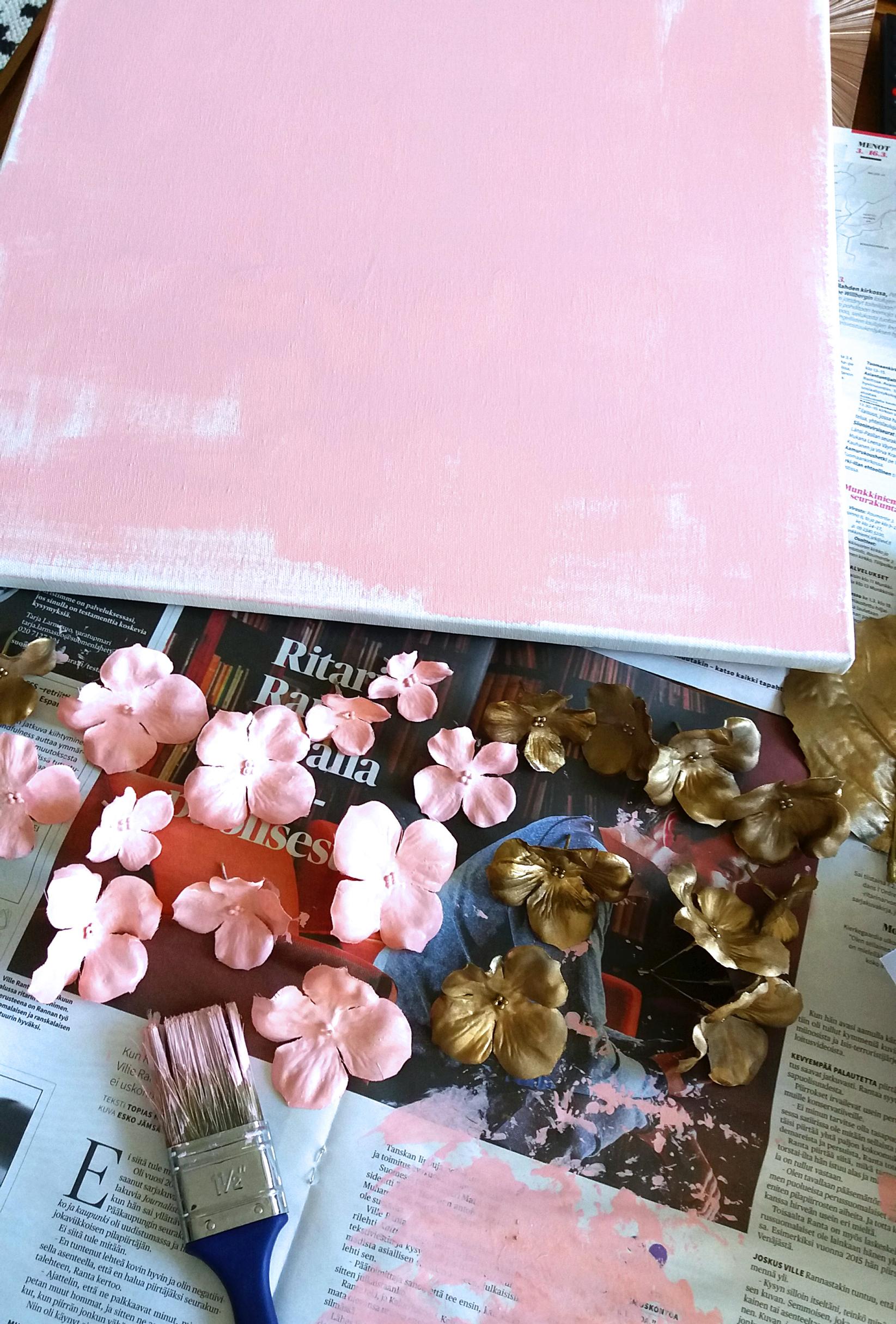 2. Maalaa tekokukista irrotettuja kukintoja samalla maalilla. Maalaa osa kukista efektin vuoksi kultamaalilla. Erittäin kiiltävän kultapinnan saa Mastonin kultaspraymaalilla.